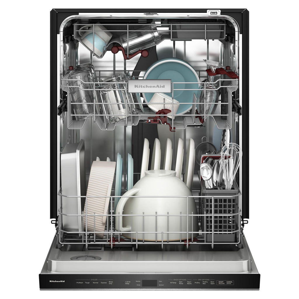 Achieve spotless results with the KitchenAid 44 dBA Dishwasher, featuring 50+ Total Wash Jets and a 360 degree Max Jets Third Rack?the largest third rack available. With advanced cleaning and drying technology like True Self-Cleaning Filtration, ProDry System, and Automatic Door Open Dry, this dishwasher delivers powerful performance and table-ready results every time. Its spacious 7.25 cu. ft. MaxTub fits more dishes and cookware, while running quietly at just 44 dBA?perfect for open-concept kitchens.