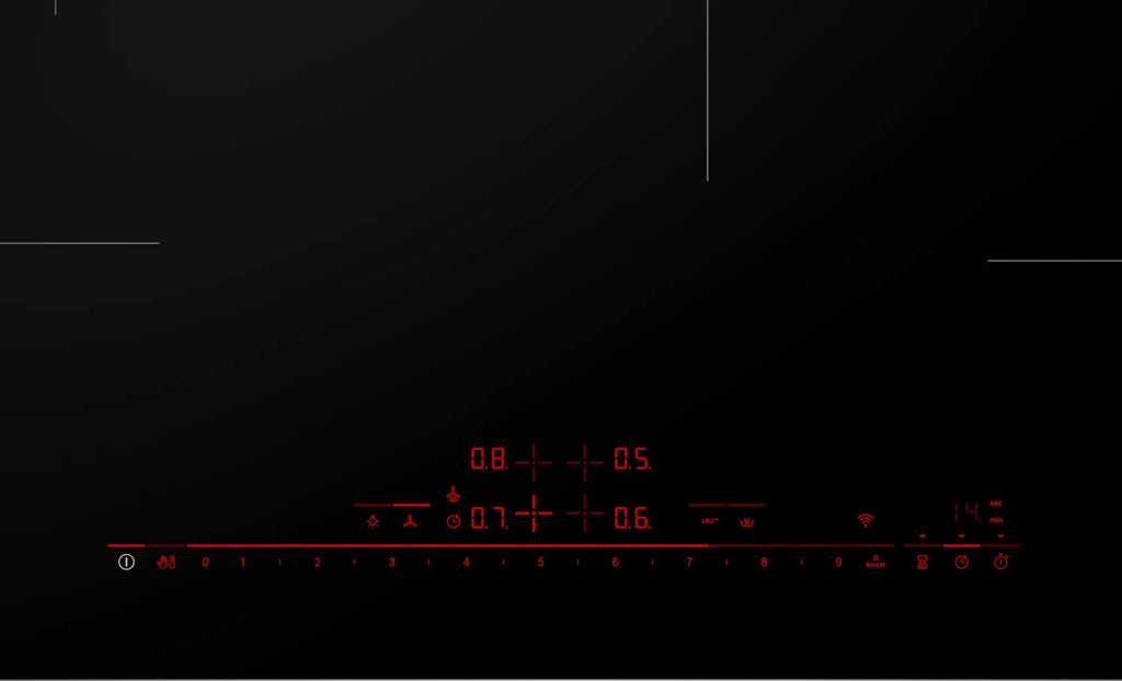PreciseSelect® Premium controls on our induction and electric cooktops offer premium usability during cooking. The choice of desired cooking zones, power levels and individual functions are direct and intuitively easy together with a wider LED illuminated display. The light line on power level bar and cooking zones illuminate in a more intense way when one of them has been selected.