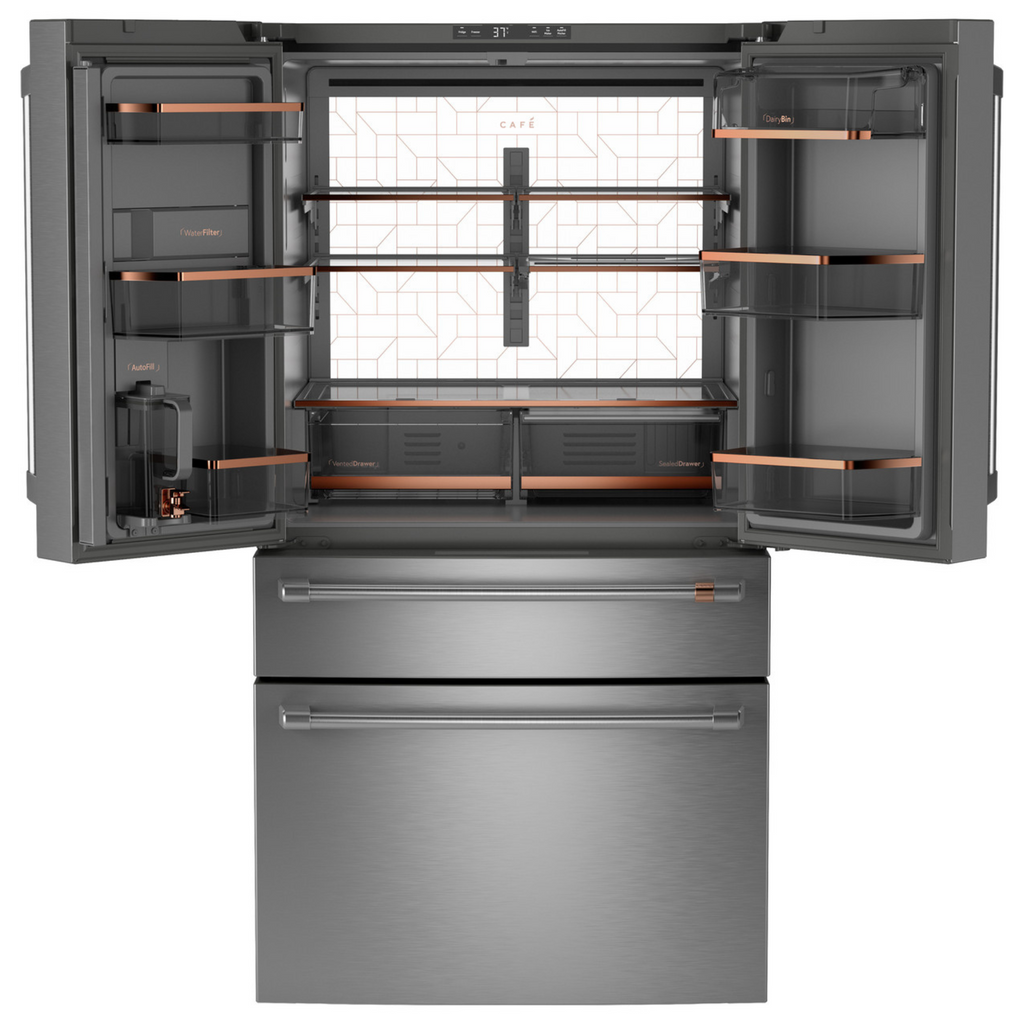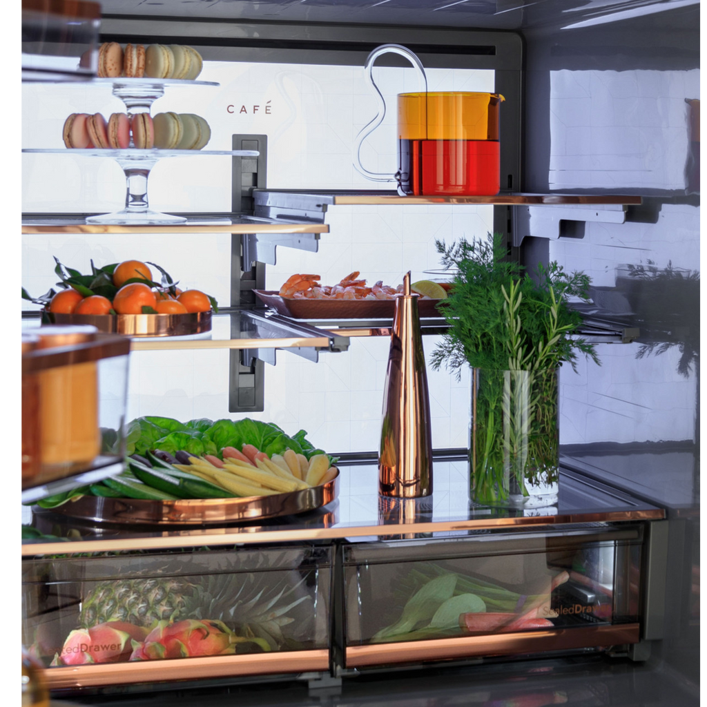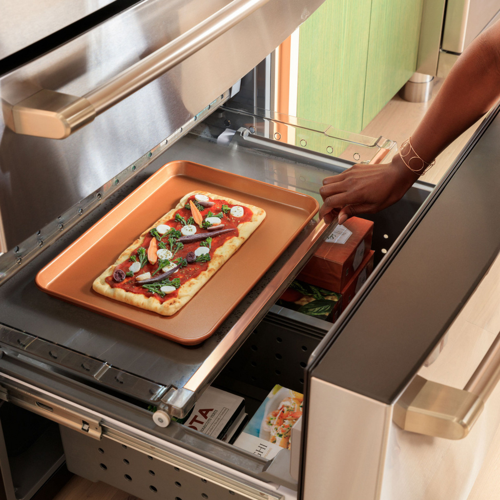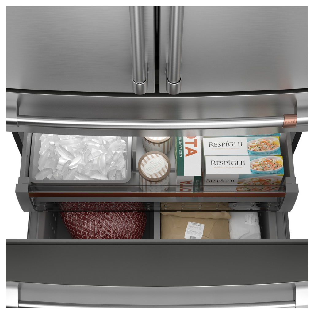A slim, full width freezer compartment designed to hold flatbread, pizzas, and other uniquely shaped frozen items is one of the many sliding shelves and trays in this three-level storage system.