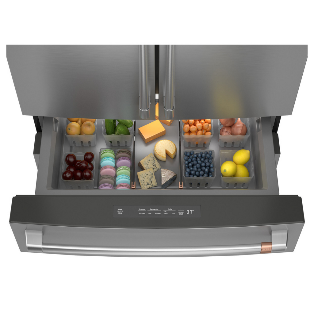 Experience true flexibility in this adjustable temperature drawer with 5 customizable temperature settings that range from 23 to 42 degrees: Soft Freeze, Meat, Beverages, Snacks, and Wine Bottles.