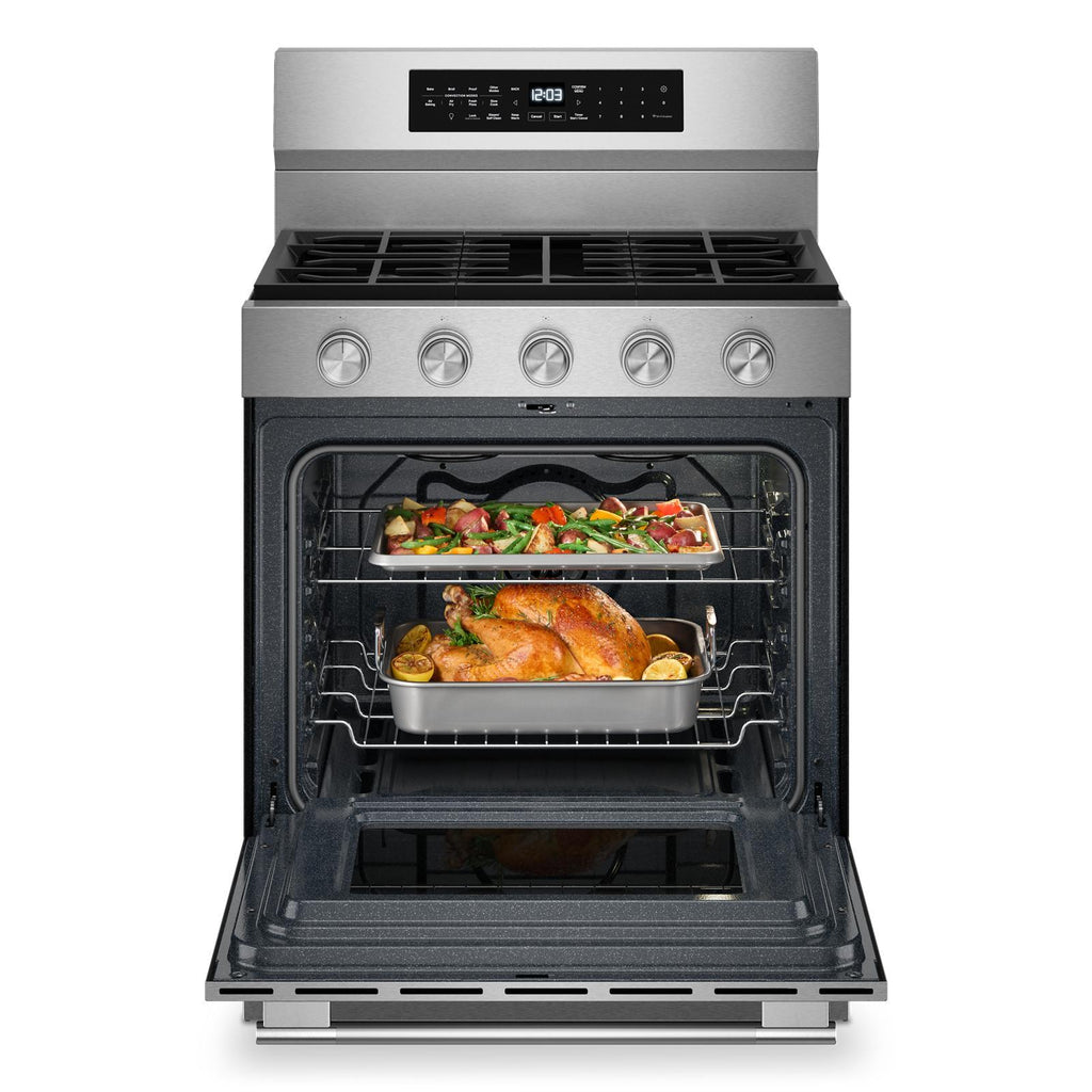 Enjoy a range of possibilities with our most powerful KitchenAid 30-inch Gas Range available. A WiFi-enabled Smart Appliance featuring Convection Cooking Modes that help you get consistent results with optimal temperatures. A spacious 5.0 Cu. Ft. Capacity and optimized oven system design with Rapid Preheat gets your oven to 350°F in under 8 minutes. Keep your oven clean with two distinct cleaning cycles: the Steam Clean Cycle, perfect for quick, routine maintenance, and the high-temperature Self-Clean Cycle for a deeper clean. Using Rapid Preheat to 350 degrees when cooktop is not in use.