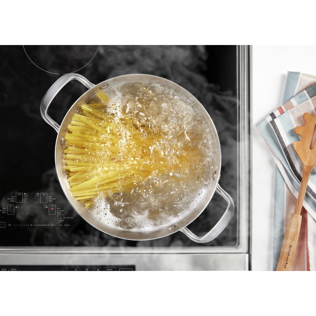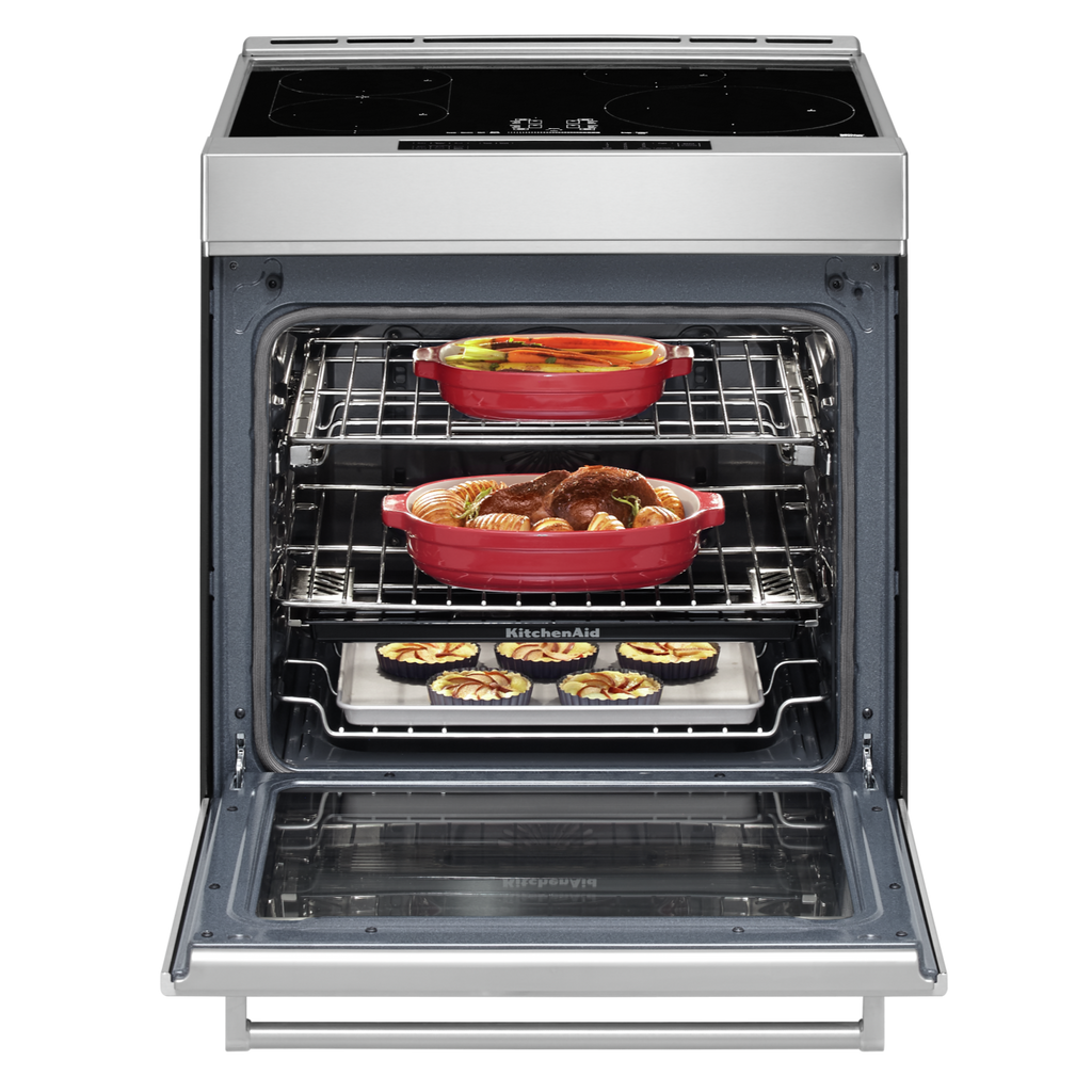 This KitchenAid 6.4 cu. ft. 30-inch 4-Element Induction Slide-In Convection Range combines the precision of induction with the power of Air Fry. Sensor-induction cooktop generates heat directly within cookware, and the oven features Even-Heat True Convection plus air fry mode, with an included dishwasher-safe air fry basket that aids in crisping and browning.