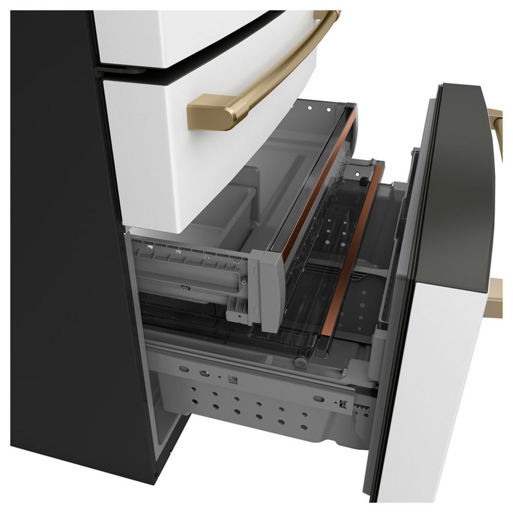 A slim, full width freezer compartment designed to hold flatbread, pizzas, and other uniquely shaped frozen items is one of the many sliding shelves and trays in this three-level storage system.