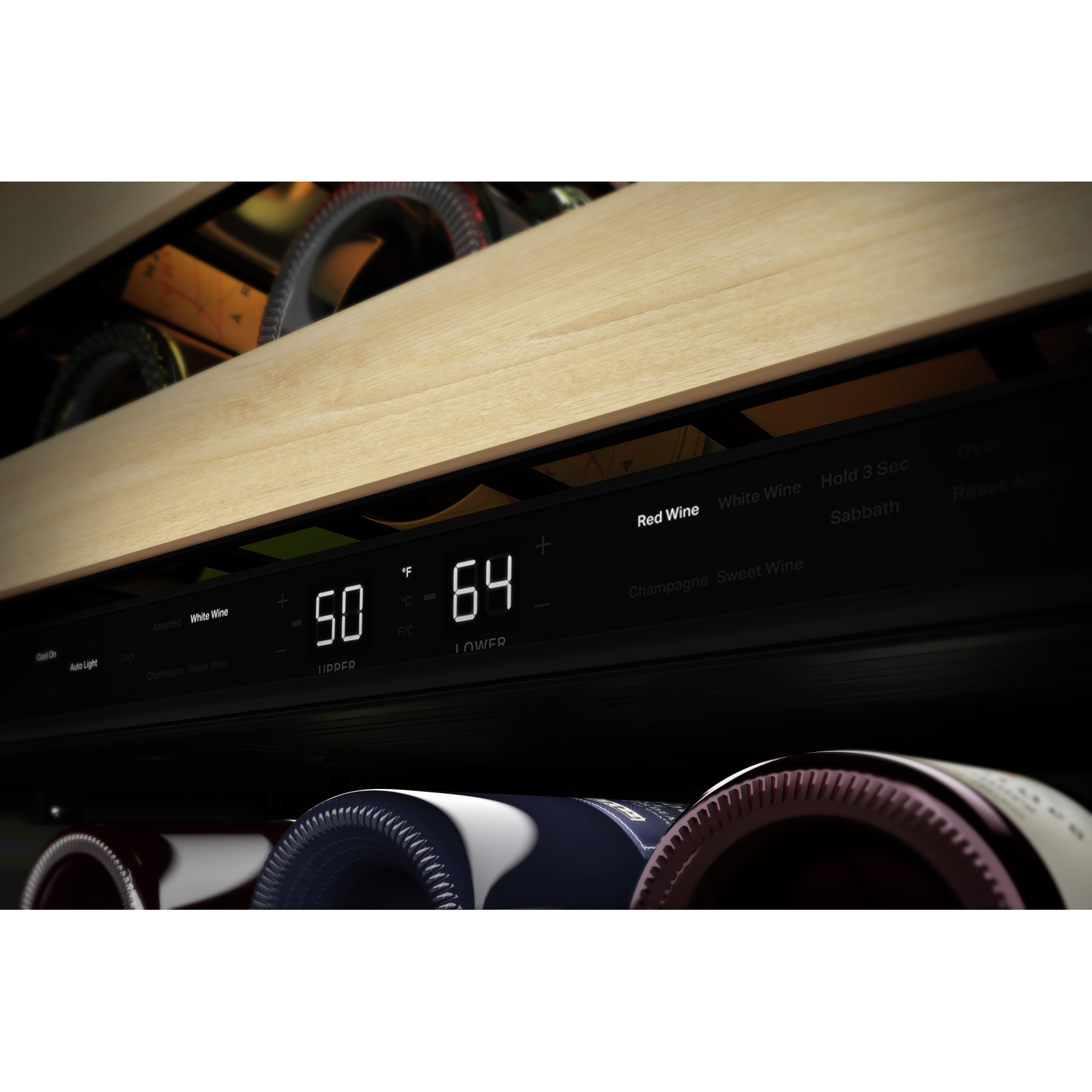This Undercounter Wine Cellar with Full-Extension Wood-Front Racks holds up to 46 standard Bordeaux-size bottles. Two Temperature-Controlled Zones let you separate reds and whites to store each at the temperature you enjoy, and Motion-Activated LED Lighting turns on as you approach, making it easy to see what's inside. Fully Flush Installation and Panel-Ready Design let you seamlessly match your cabinetry.