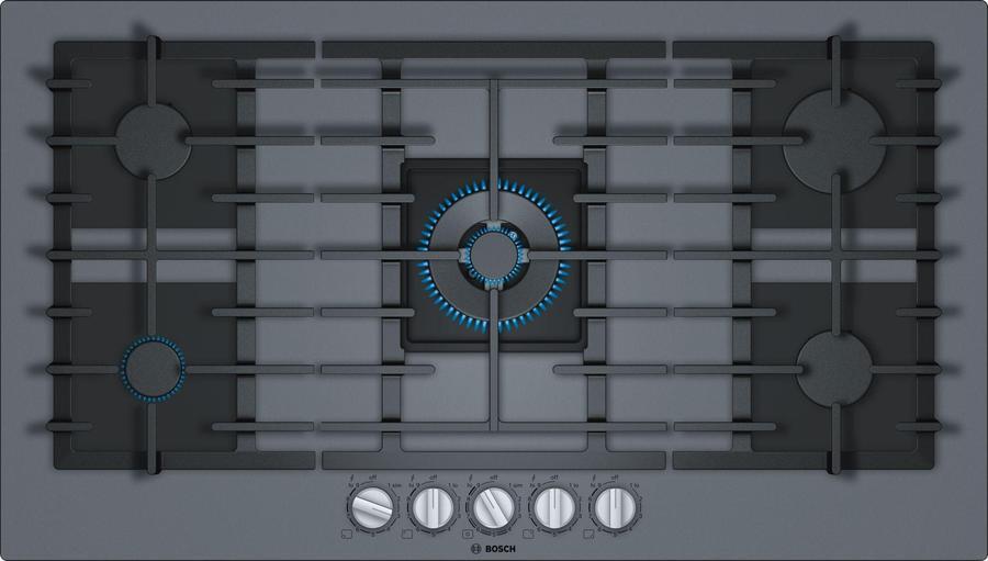 The Bosch Benchmark 36 inch tempered glass gas cooktop with FlameSelect achieves consistent cooking results thanks to nine precisely defined power levels.