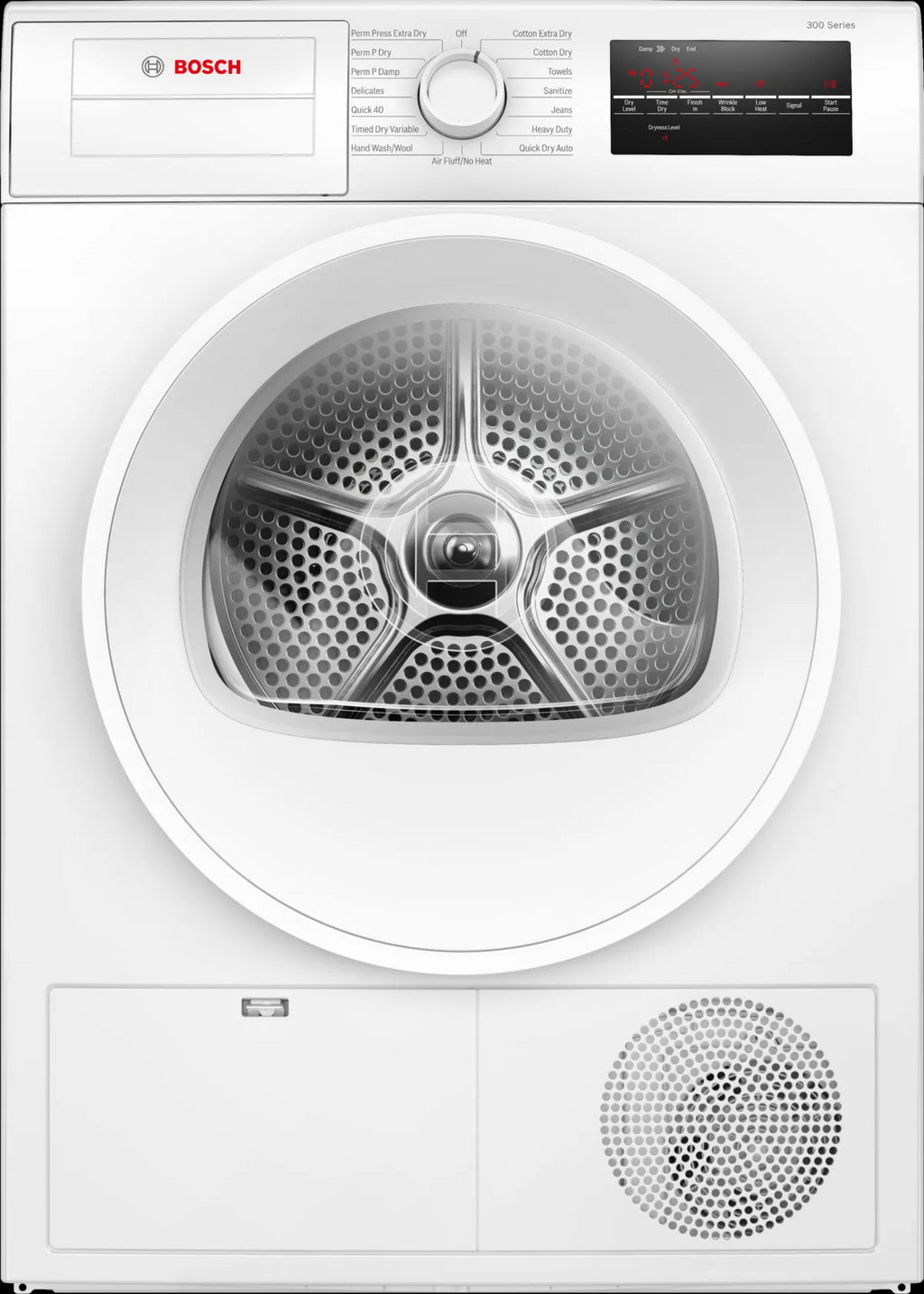 The Bosch 24-inch compact dryer can be installed stacked, side-by-side, on pedestals, in a closet or under a counter.