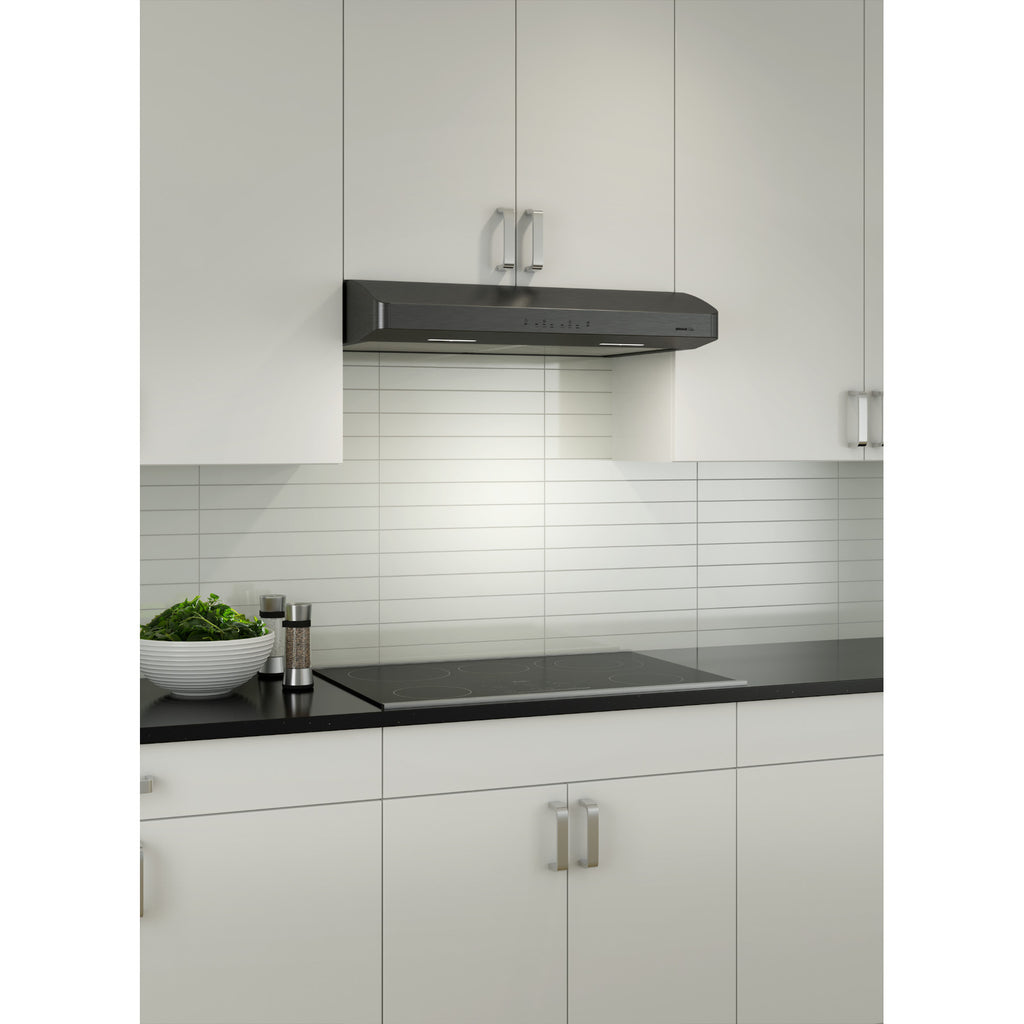 Quietest range hood offering a sound level of 0.3 sone at normal speed.