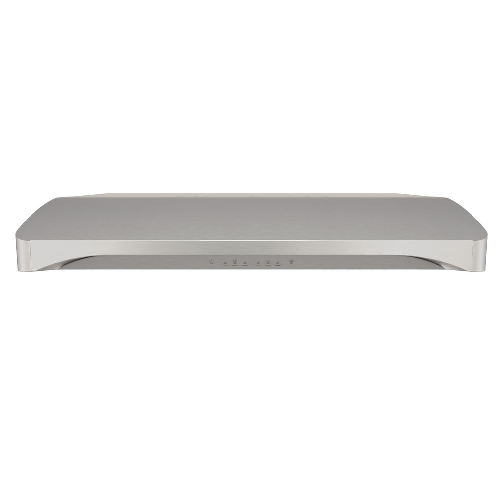 Three-speed, whisper touch infrared control is a pleasure to use and admire. Delay off feature runs the blower for 10 minutes after cooking to clear the air.