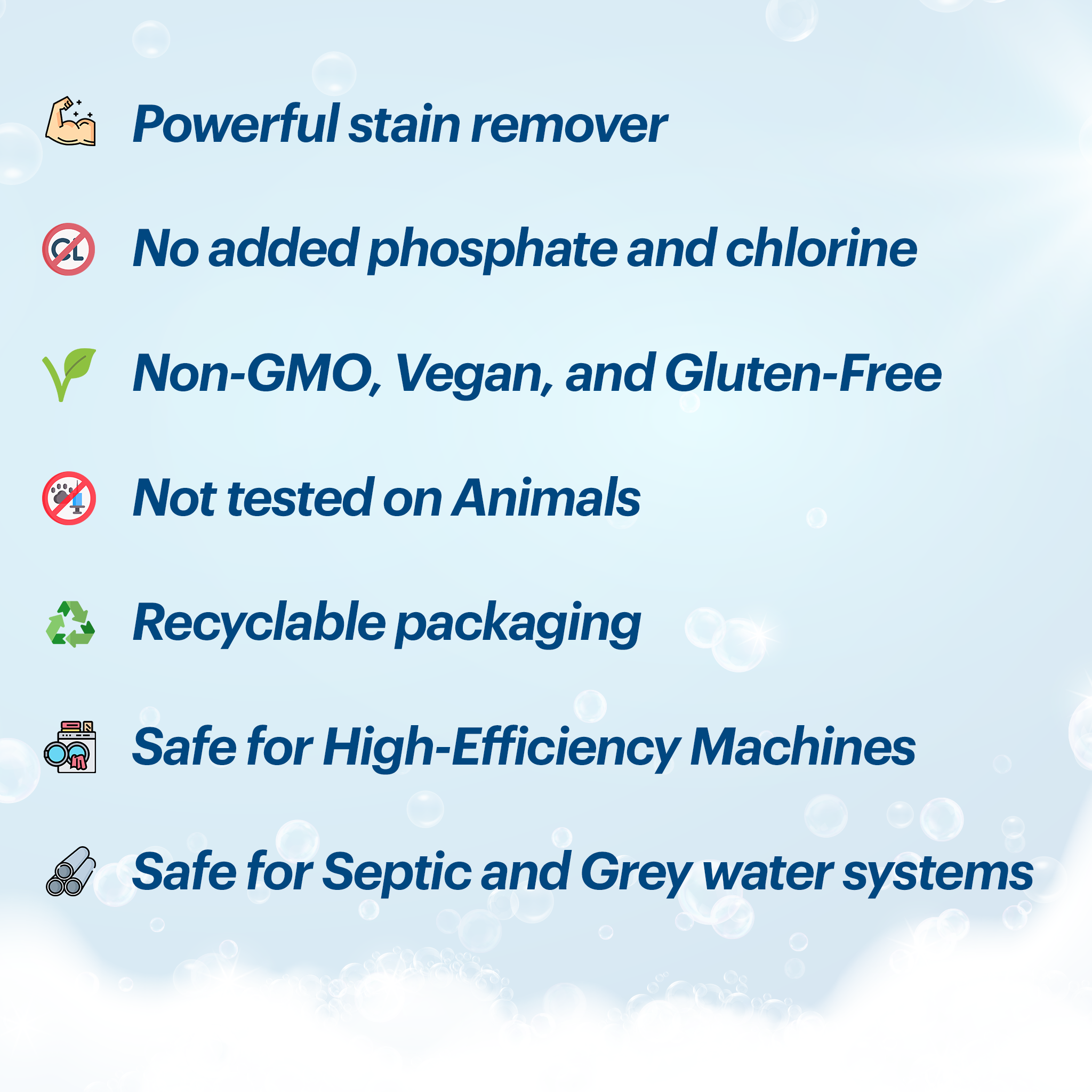 Our laundry soap binds the natural power of enzymes to eliminate even the most stubborn stains, leaving your clothes immaculately clean and fresh after every wash. While safe for High-Efficiency Machines that use less water and energy, contributing to reduced resource consumption.