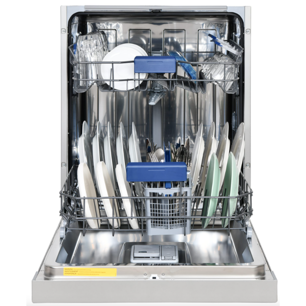 The Danby DDW2400ESS 24" Built-In Dishwasher in Stainless Steel combines durability, efficiency, and style. Its stainless steel tall tub design resists stains, odors, and rust, ensuring a pristine look for years. Operating quietly at 51 dB, it maintains a peaceful kitchen ambiance. Energy Star compliant, this dishwasher is both eco-friendly and cost-effective. With a 14 place settings capacity and 4 versatile wash cycles, it easily handles large family meals or dinner parties. The convenient delay start feature allows you to schedule washes up to 24 hours in advance. The fixed upper dish rack and upper basket mug shelf provide secure and organized spaces for all your dishes. Available in both White and Stainless Steel finishes, it seamlessly integrates with any kitchen decor, offering both functionality and elegance.