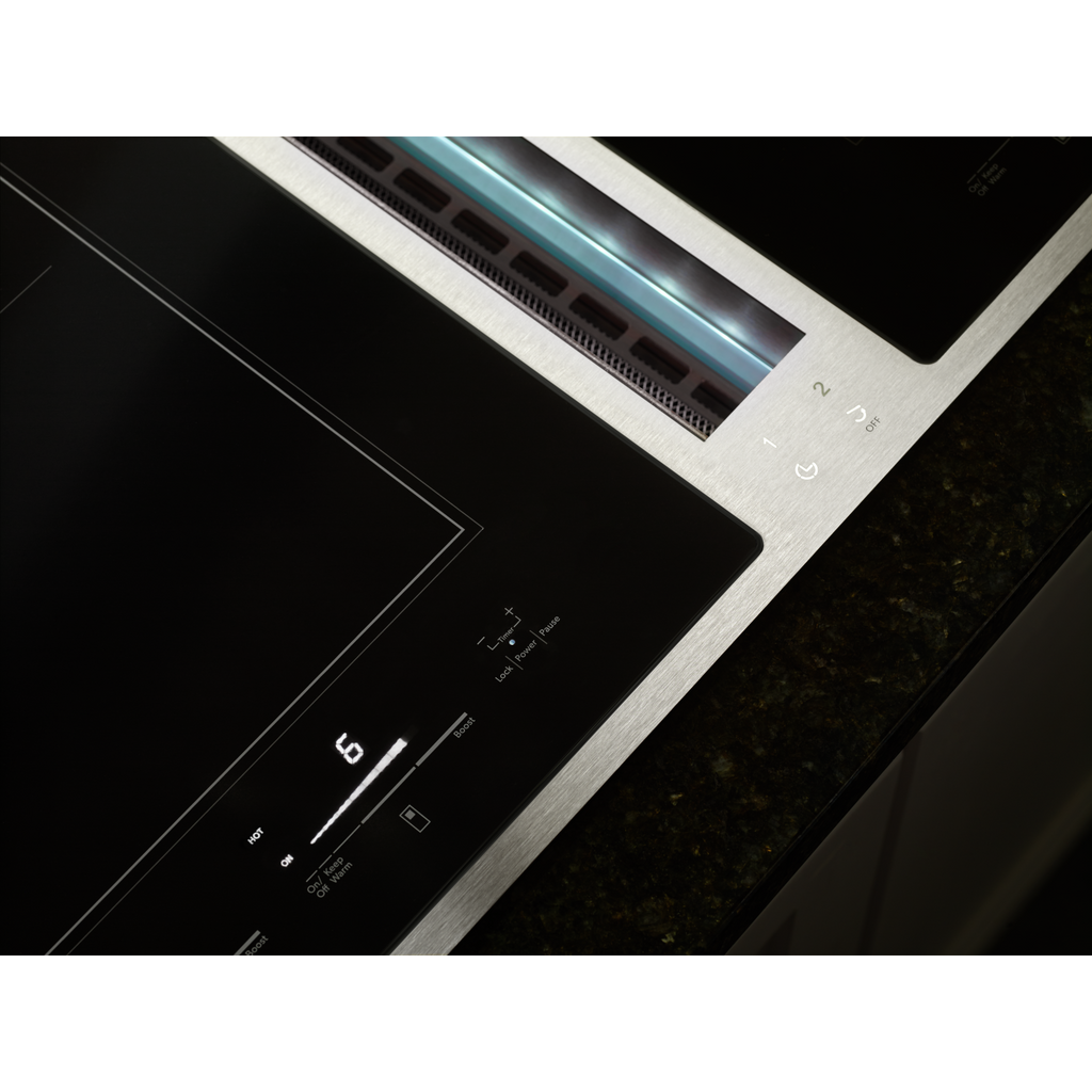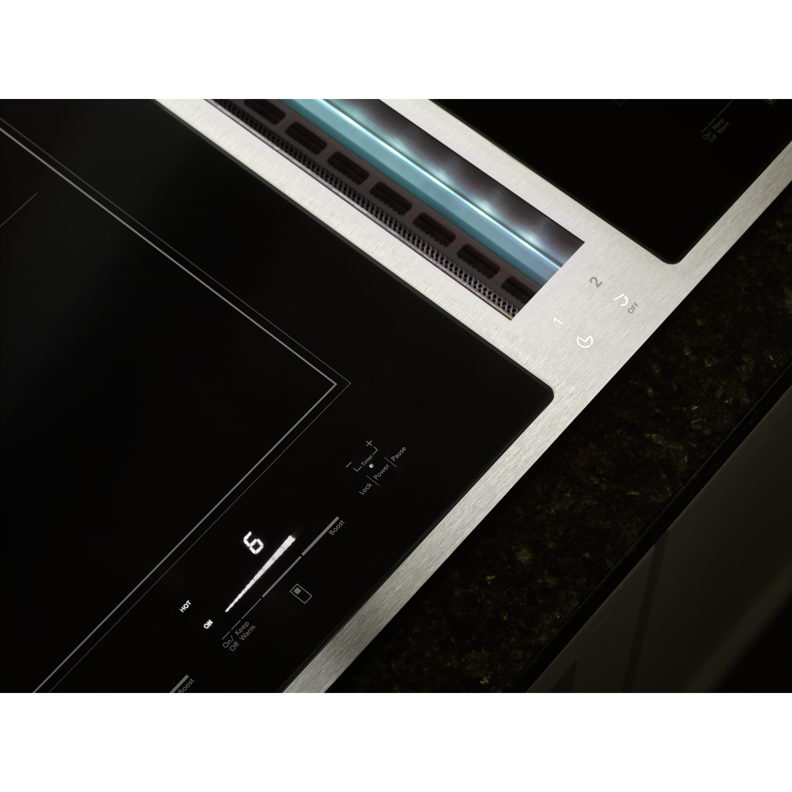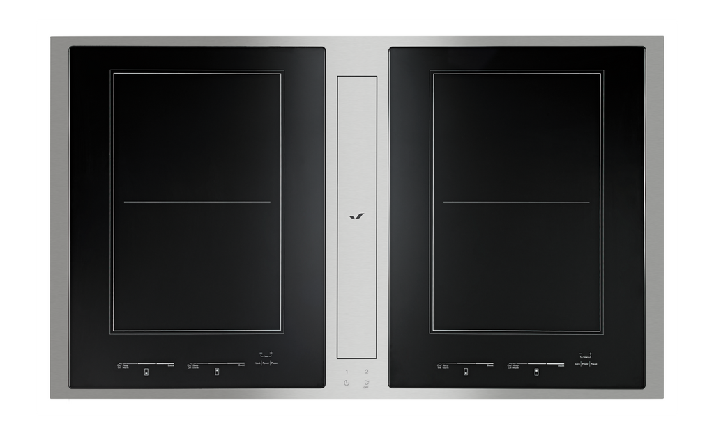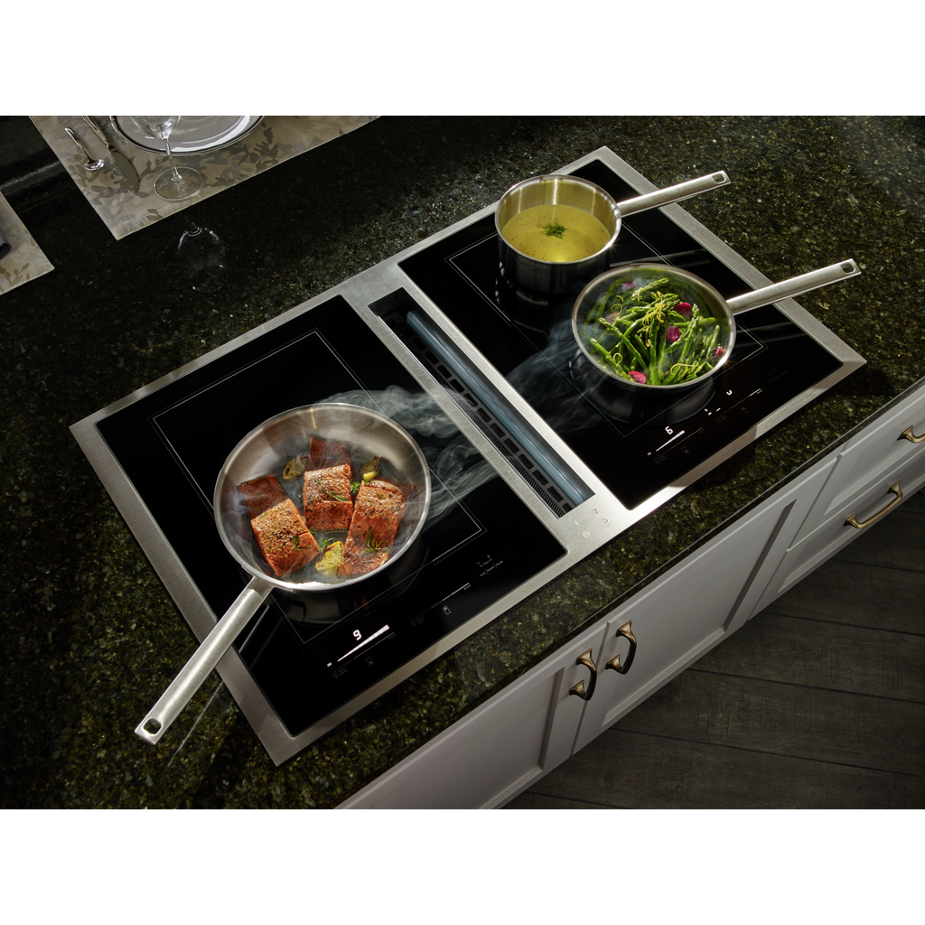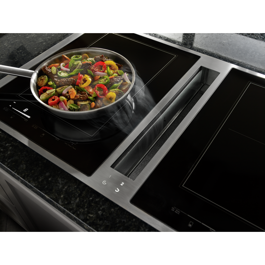 Developed and refined by Jenn-Air, a downdraft ventilation system uses proximity ventilation to capture smoke, steam and odors at the cooking surface, whisking them down and out of the kitchen before they can escape.
