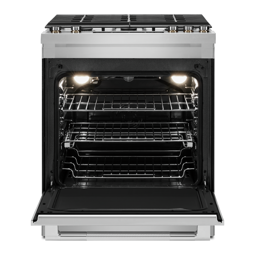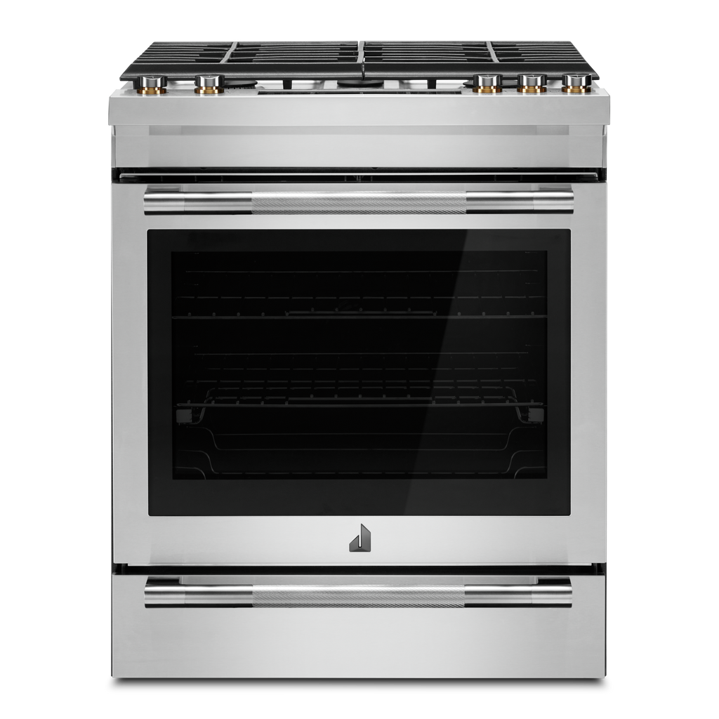 Robust, die-cast metal knobs offer precise control and coordinate with the range's design.