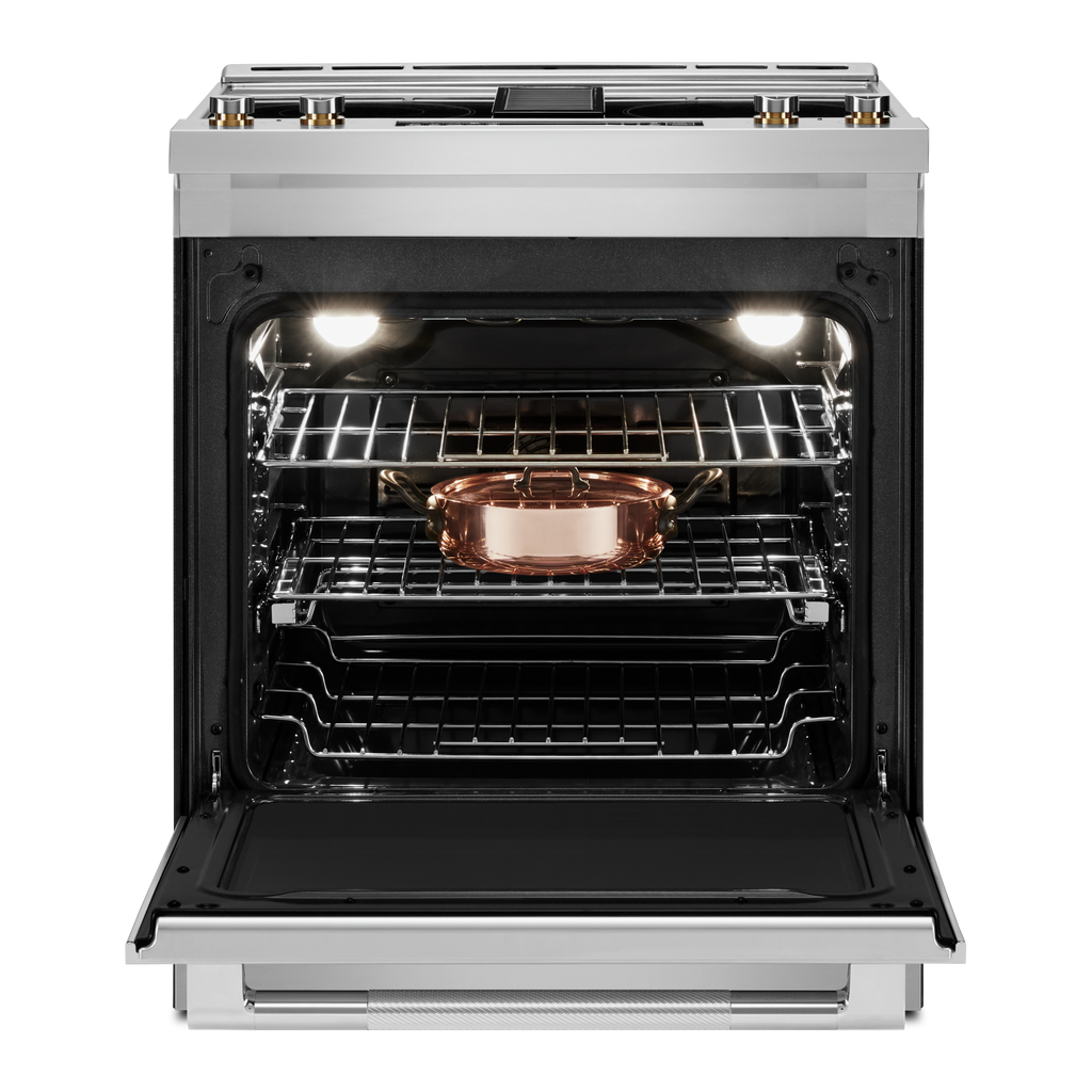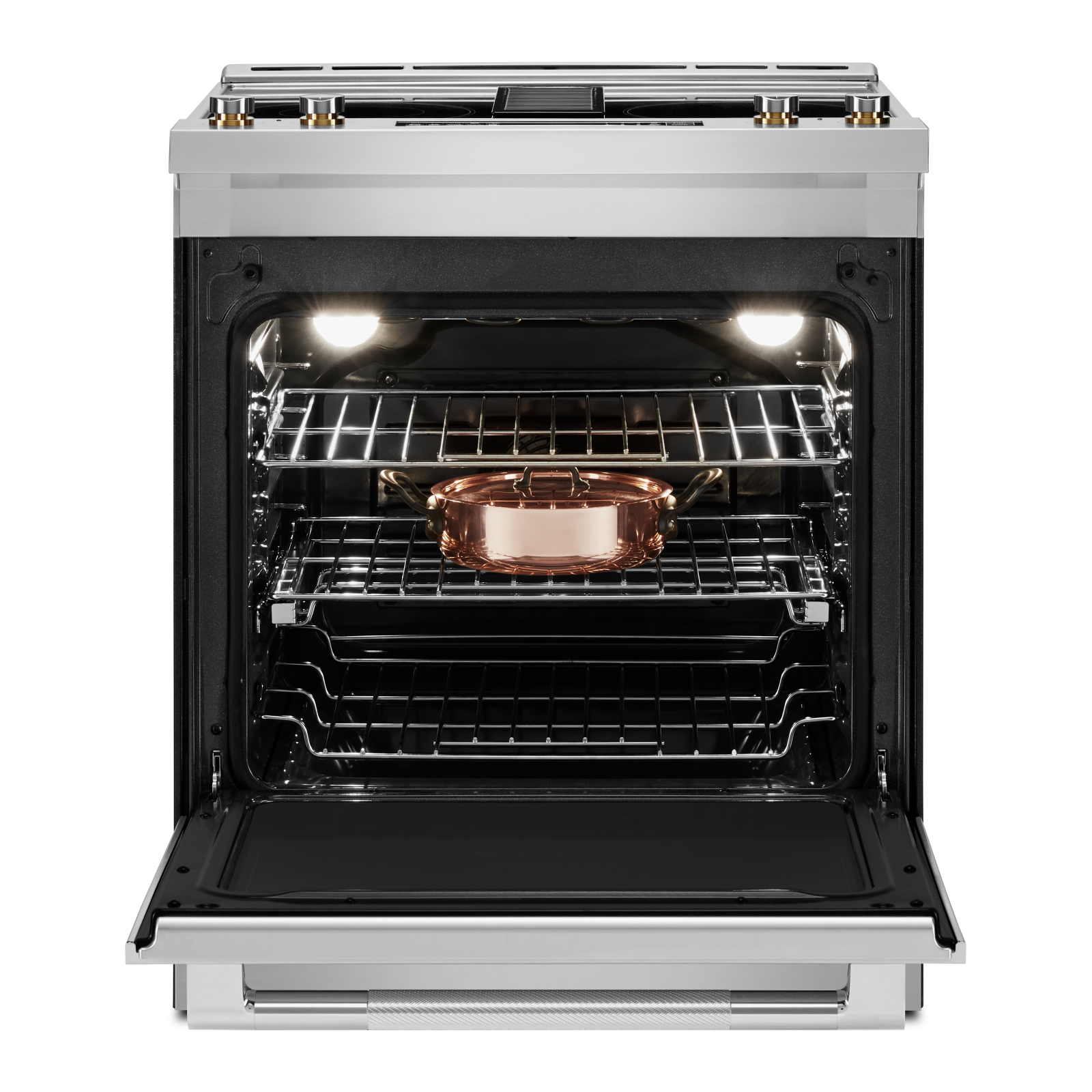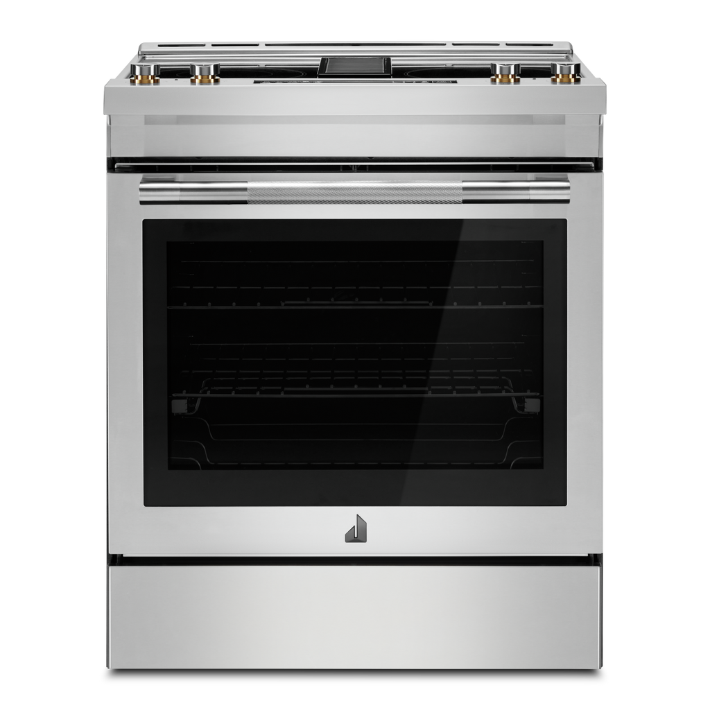 Robust, die-cast metal knobs offer precise control and coordinate with the range's design.