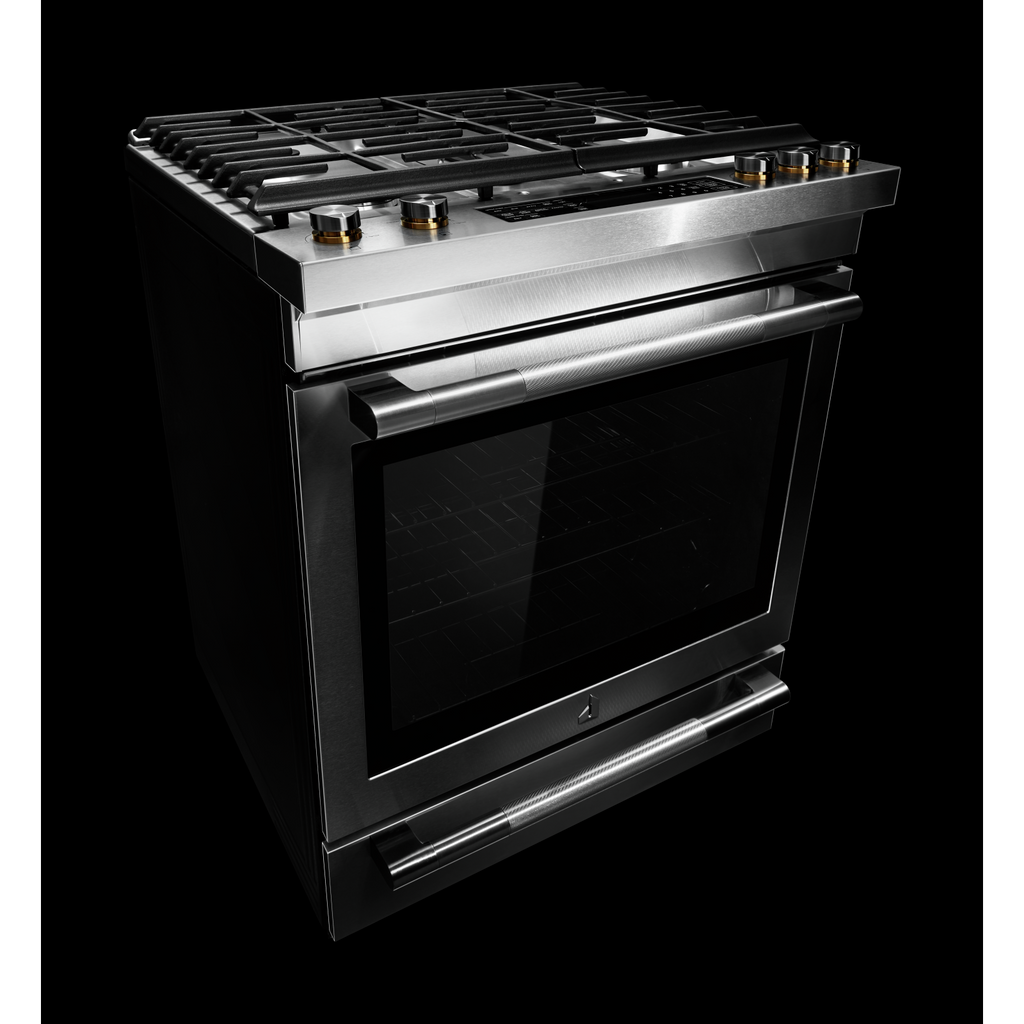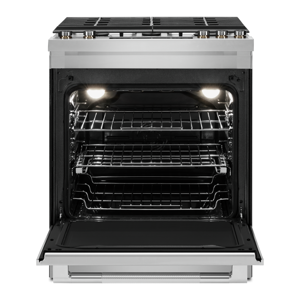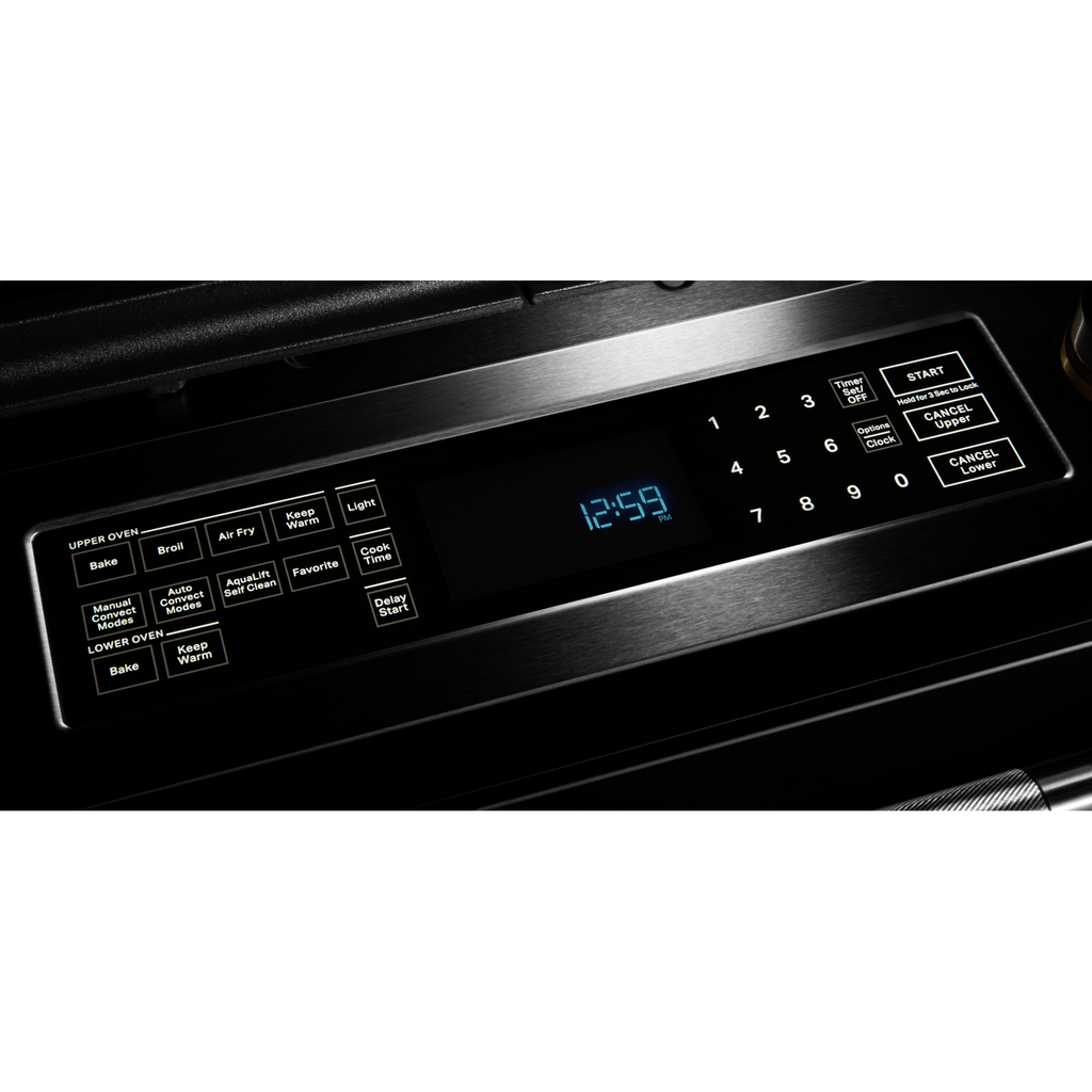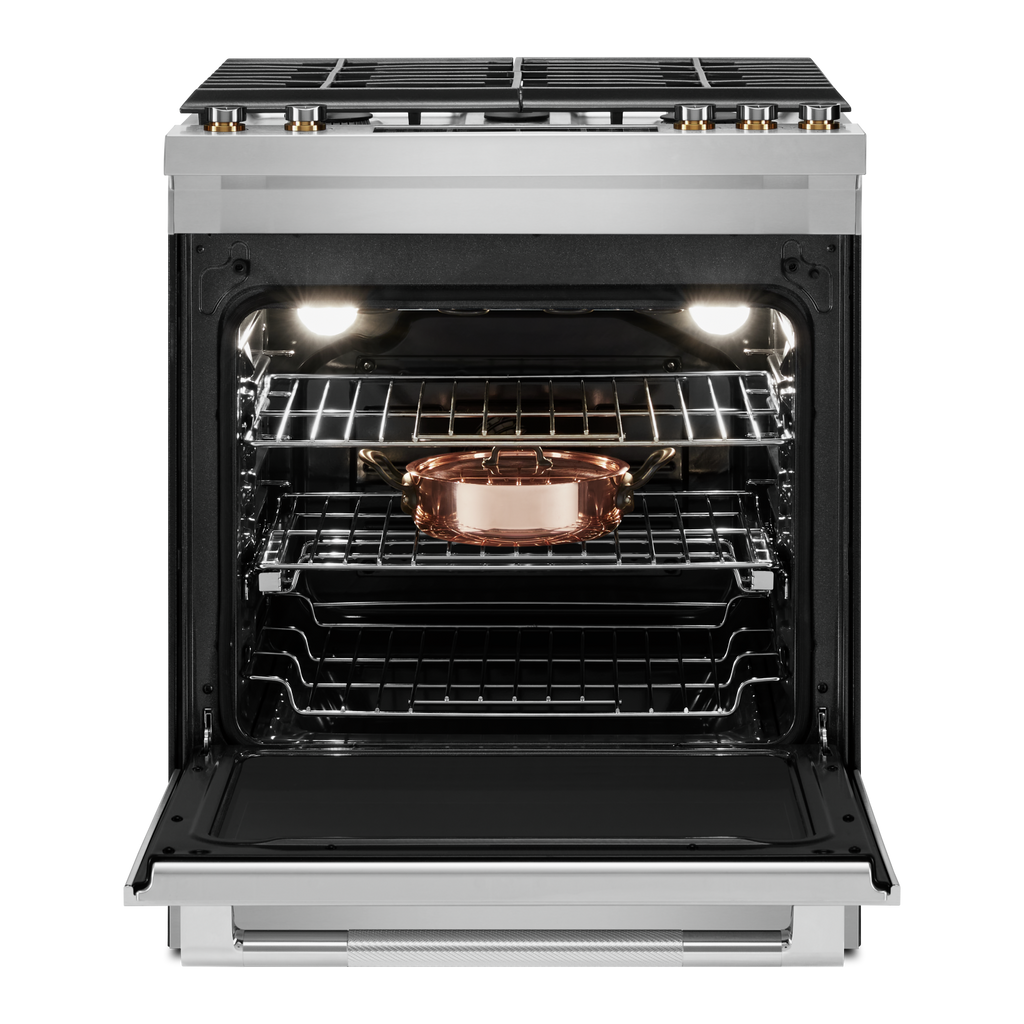 Robust, die-cast metal knobs offer precise control and coordinate with the range's design.