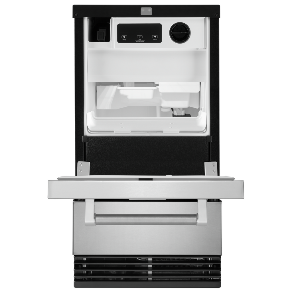 This appliance represents a reimagining of what a true cook's kitchen can be with a bold blend of commercial styling and sleek touches for the home. The ice maker's handles feature the iconic red medallions that speak to KitchenAid's timeless craftsmanship.