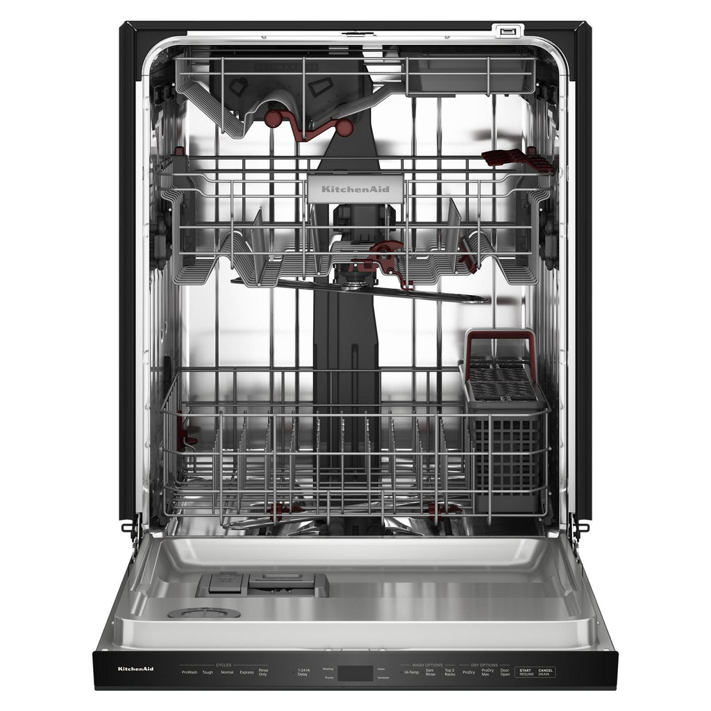 Tackle tough messes with the KitchenAid 44 dBA Dishwasher, built for powerful, quiet performance. With 50+ Total Wash Jets and the exclusive 360 degree Max Jets Third Rack, it provides full-coverage cleaning?even for mugs and bowls on the top rack. The spacious 7.25 cu. ft. MaxTub fits up to 10 extra glasses and offers flexible loading for cookware and stemware. Enjoy table-ready results with the Advanced ProDry System and Automatic Door Open Dry, which use heat, fans, and natural airflow for KitchenAid best dry performance. Quiet at just 44 dBA, and with a fast, thorough Express Wash Cycle, this dishwasher delivers performance and convenience in one sleek design.
