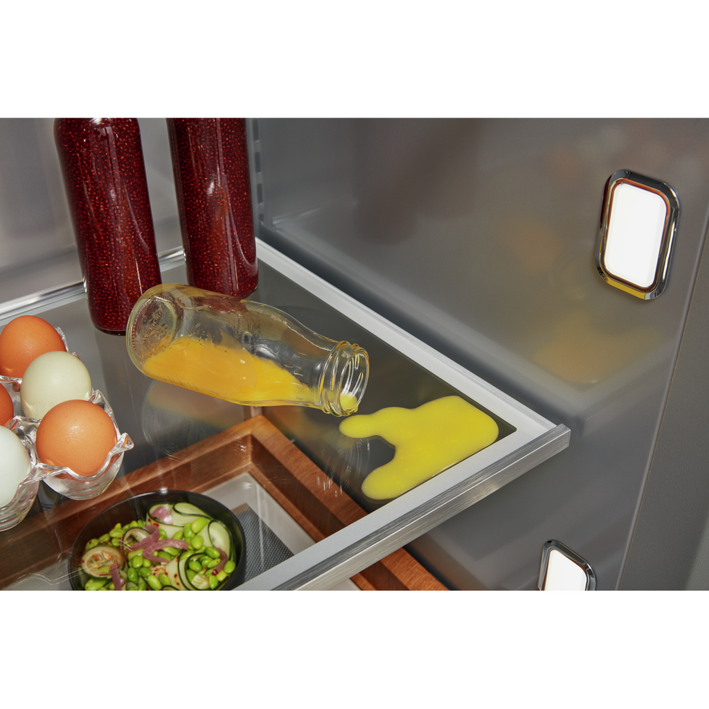 Are easy to clean and help prevent messes from spilling over into other parts of the refrigerator. The shelf edges are nano-etched with a finely textured surface that helps contain spills, and lets you use the whole shelf from edge-to-edge.