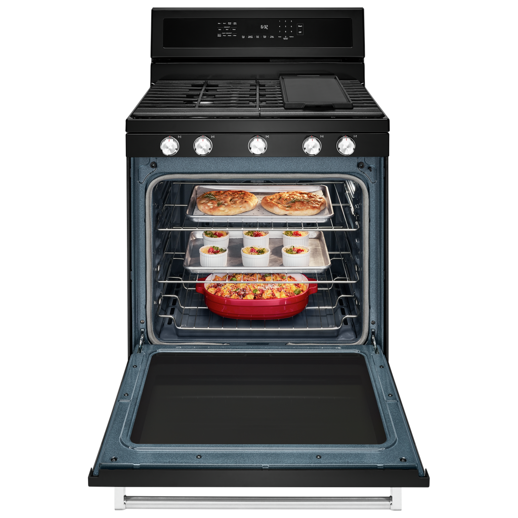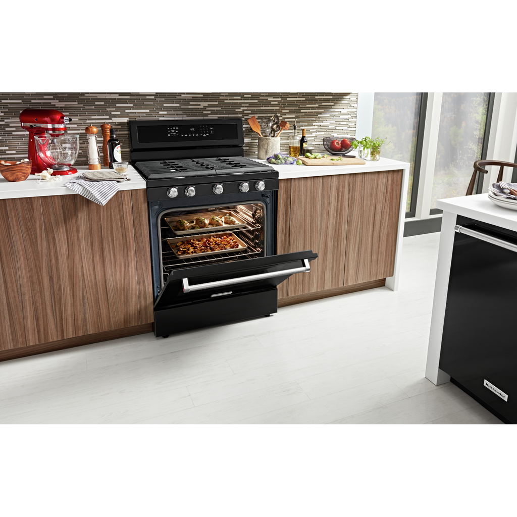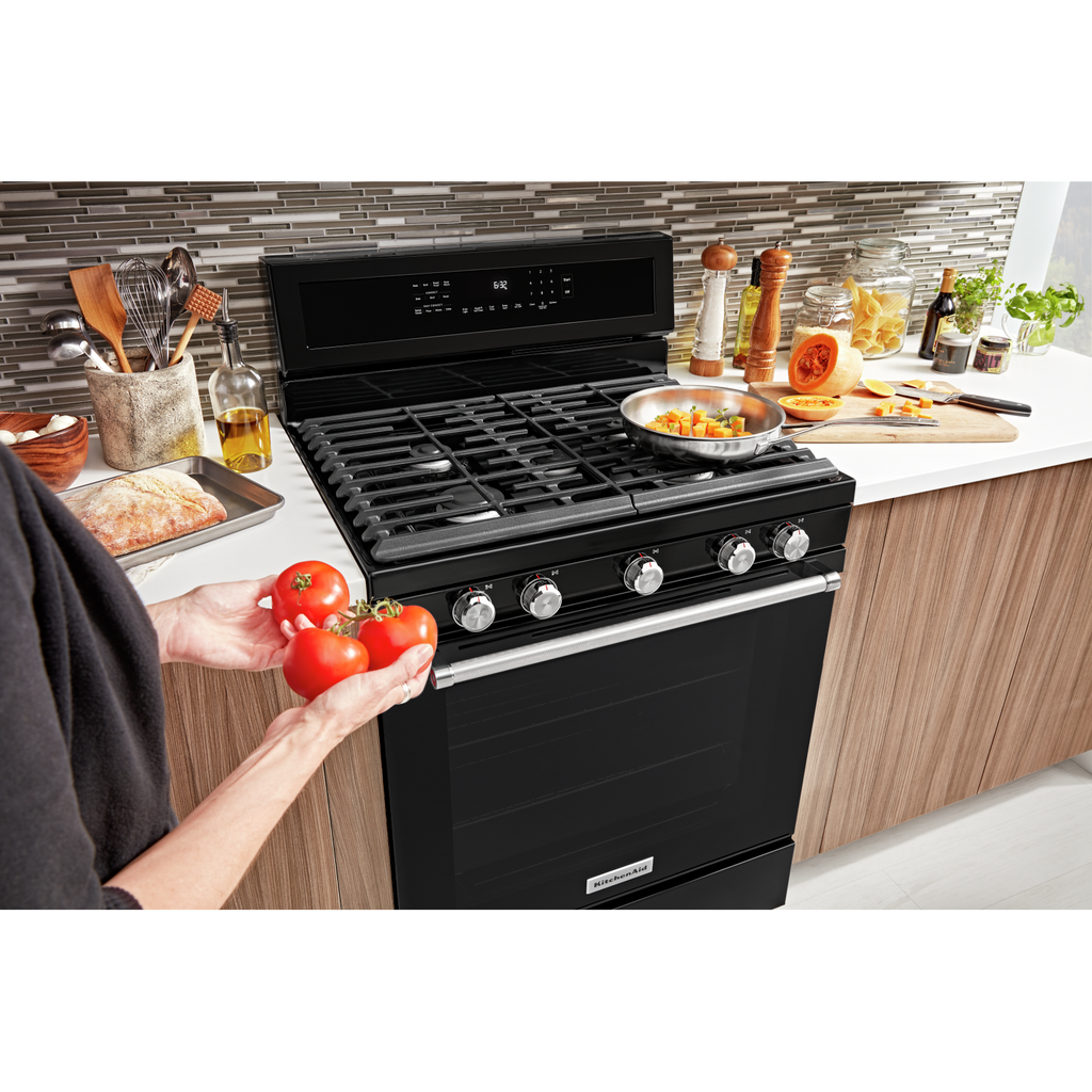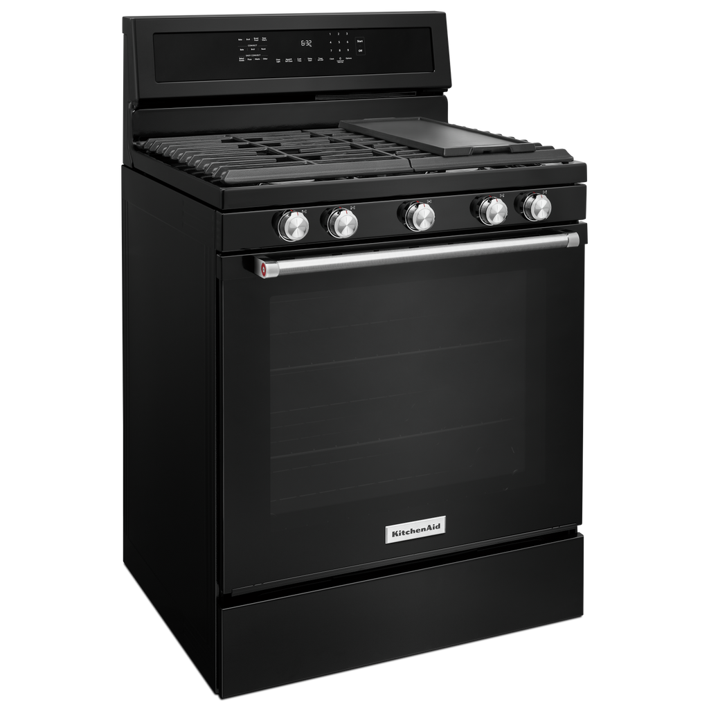 Combines a bold blend of professionallyinspired styling with sleek touches for the home. This range features Satin Textured Handles and the KitchenAid Badge, a symbol of uncompromised quality.