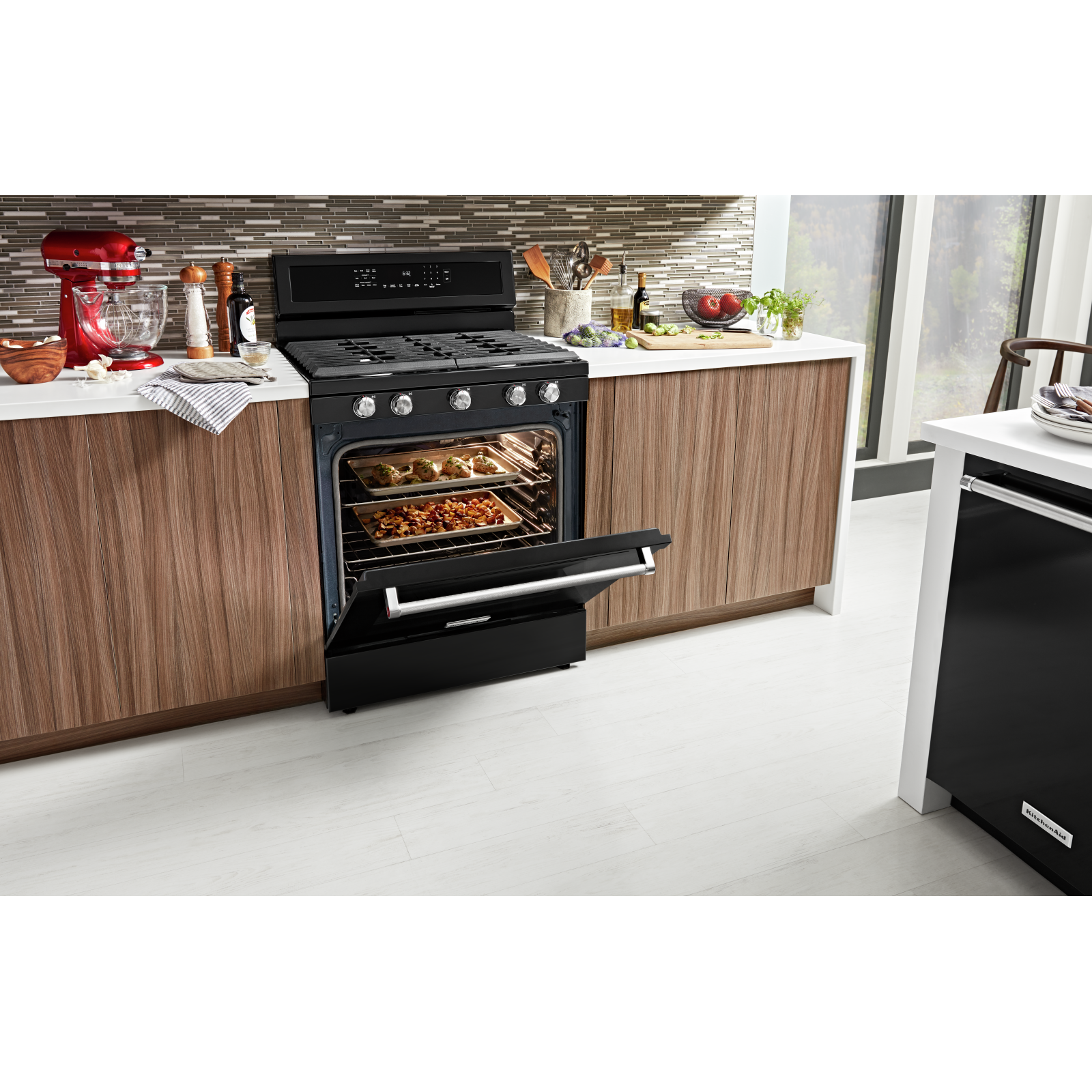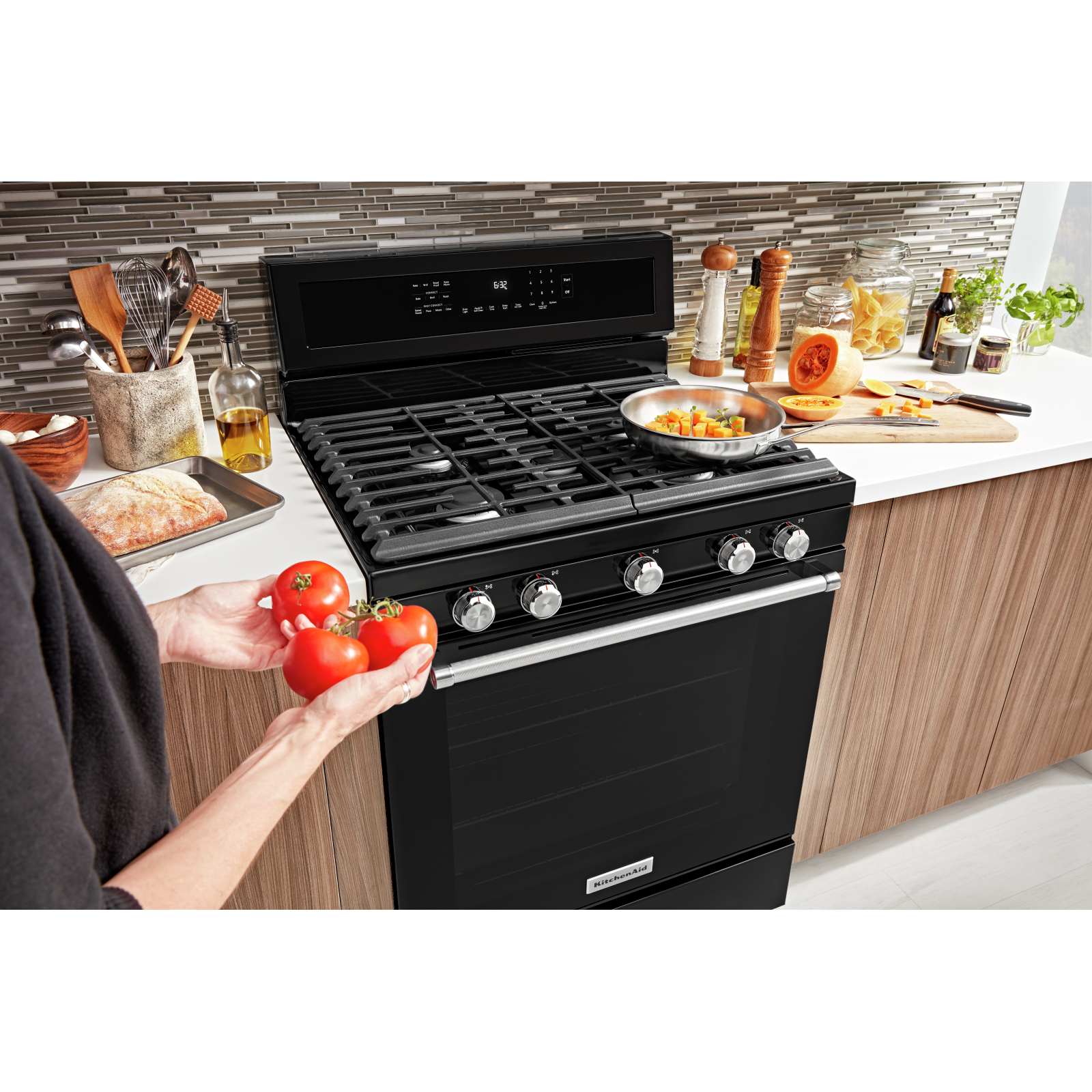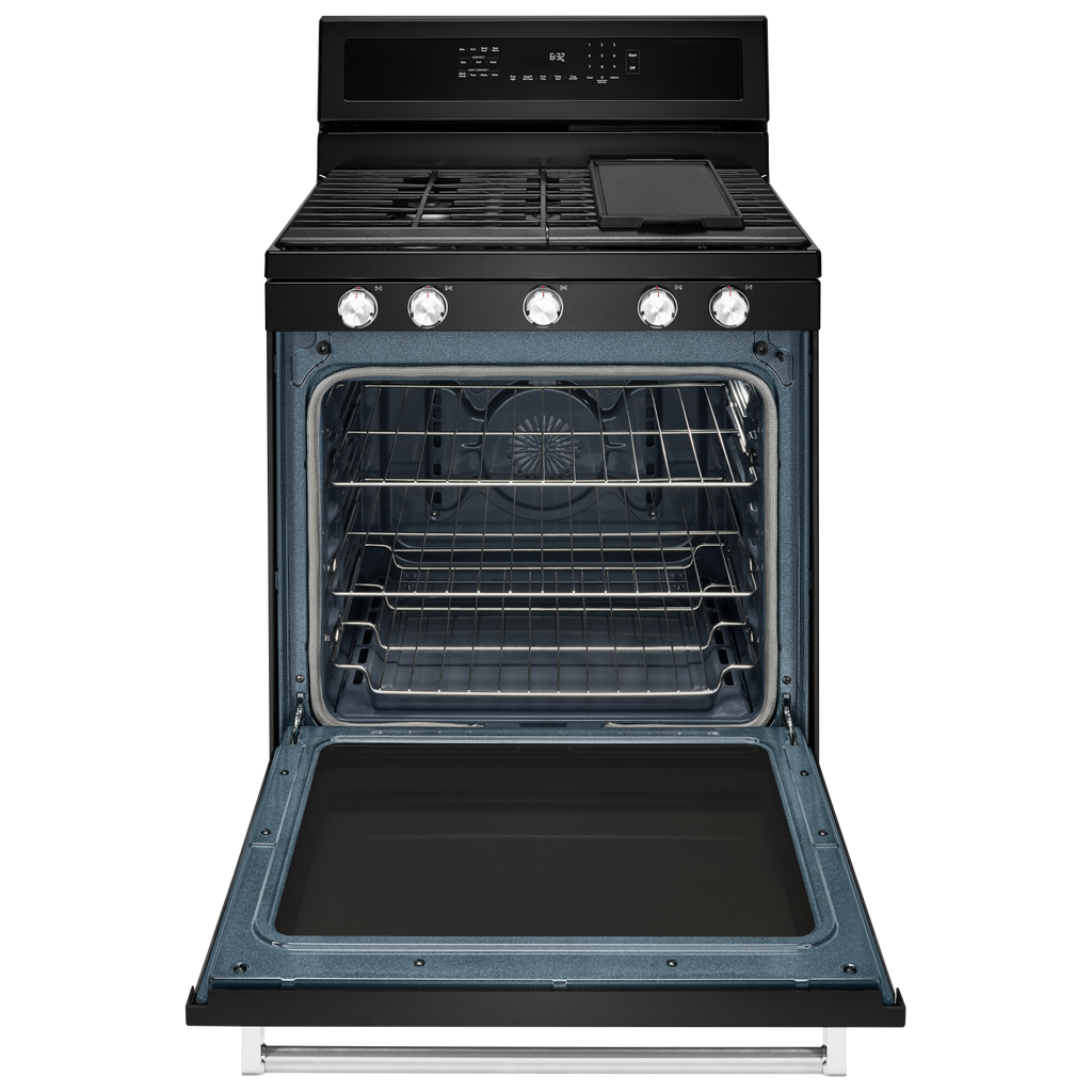 Combines a bold blend of professionallyinspired styling with sleek touches for the home. This range features Satin Textured Handles and the KitchenAid Badge, a symbol of uncompromised quality.