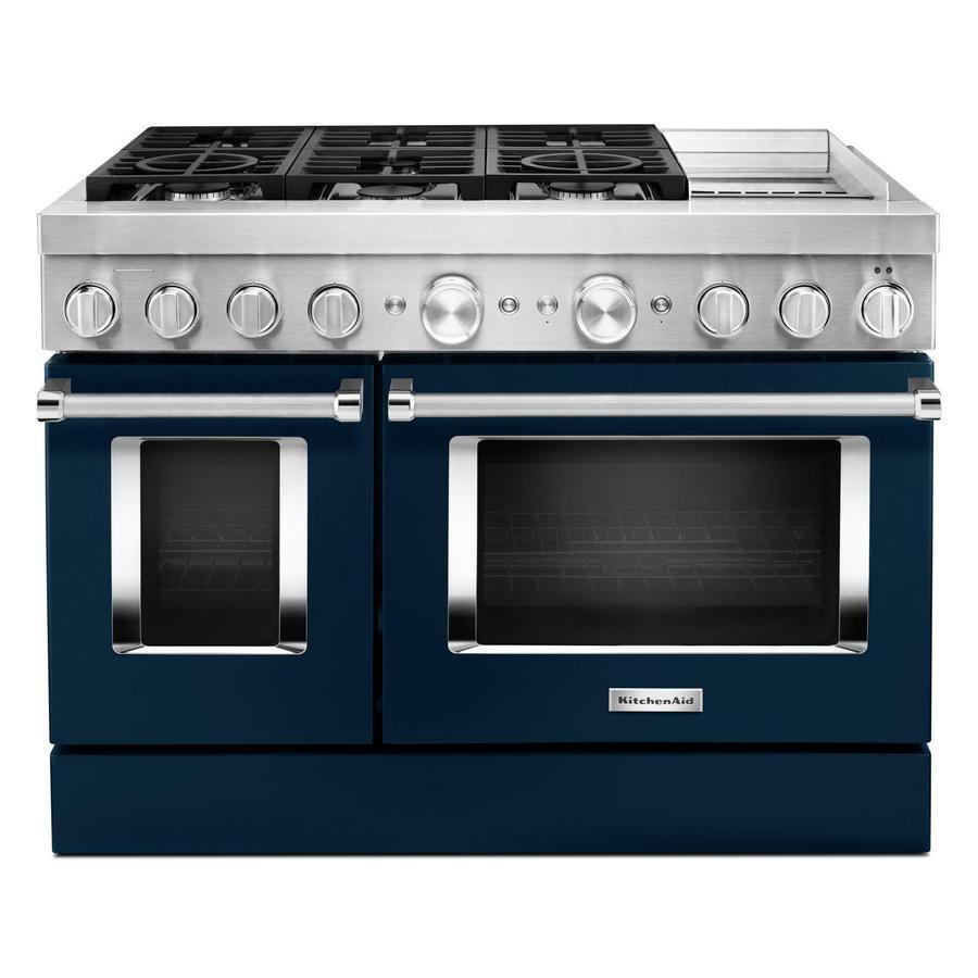 Satisfy your craving to create with a 48-inch Ink Blue KitchenAidCommercial-Style Range with Even-Heat Chrome Electric Griddle. This dual fuel range combines an electric double oven with a 6-burner gas cooktop. Two 20,000 BTU Ultra Power Dual-Flame Burners offer power and precision to successfully sear, simmer, stir-fry and saute. Even-Heat True Convection helps you achieve more consistent baking and roasting.