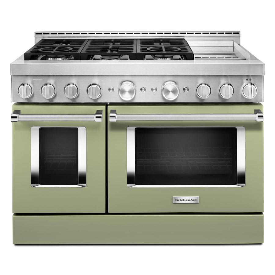 Satisfy your craving to create with a 48-inch Matte Avocado Cream KitchenAid Commercial-Style Range with Even-Heat Chrome Electric Griddle. This 6-burner gas range features two versatile 20,000 BTU Ultra Power Dual-Flame Burners with the power and precision to successfully sear, simmer, stir-fry and sauté. The double oven with Even-Heat True Convection helps you achieve more consistent baking and roasting.