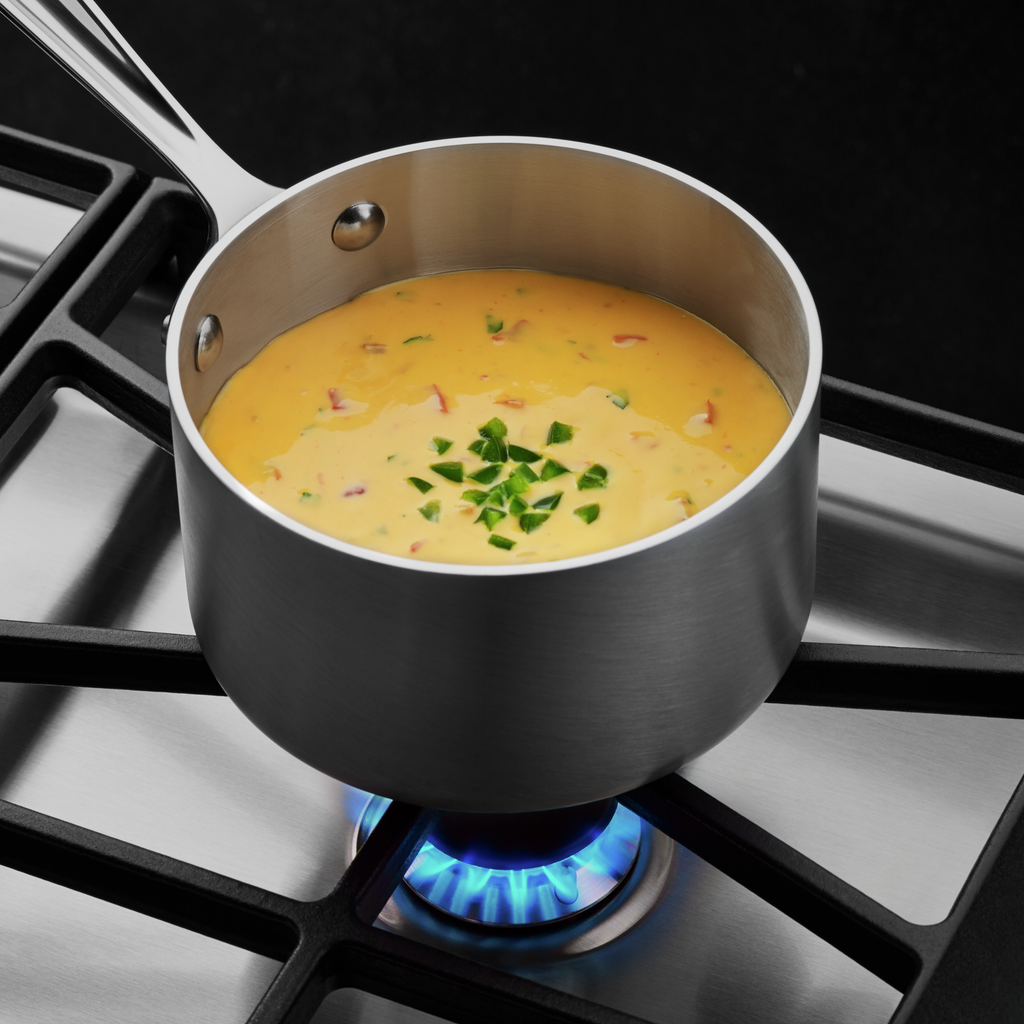 The simmer burner allows for adjustable heat control from 800 to 5,000 BTUs. The addition of a melt cap on the burner diffuses the flame for low-heat melting or warming without the need for constant monitoring.