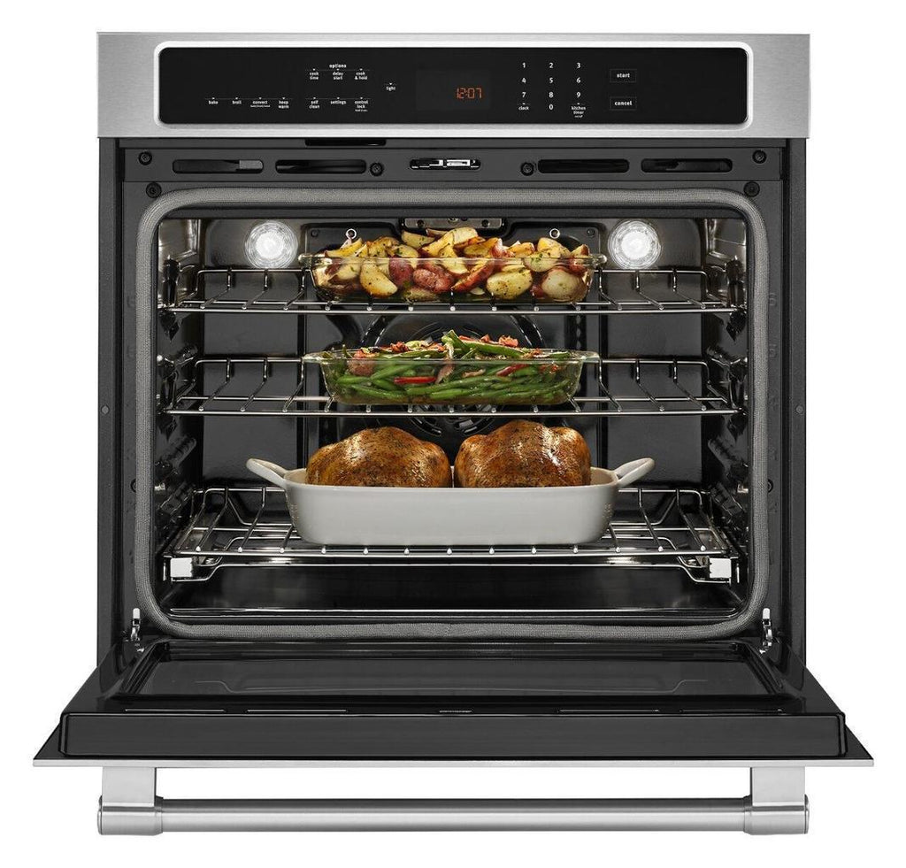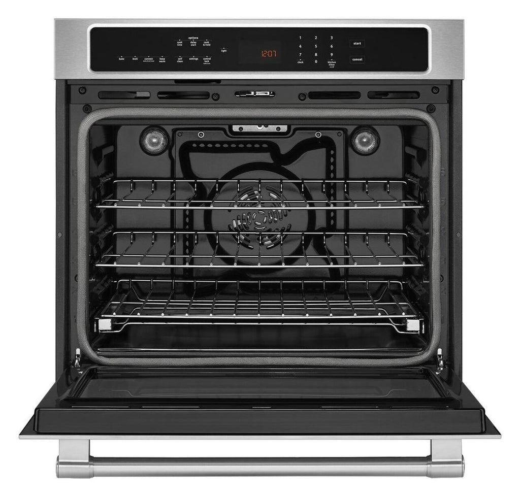 Easy-to-clean, fingerprint resistant stainless steel finish keeps your oven looking as good on the outside as it works on the inside. Material Specs, Door: Fingerprint Resistant Stainless Steel, Console: Fingerprint Resistant Stainless Steel, Handle: Stainless Steel