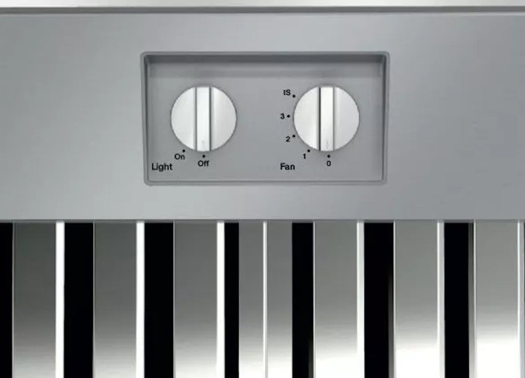 Operating the blower power and LED lighting on the ventilation hood is intuitive and effortless with discreetly integrated rotary knob controls located on the underside of the hood.
