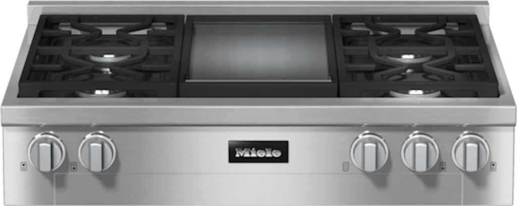 36 Inch Gas Rangetop with 4 Sealed Burners. This 36 Inch Miele gas rangetop has a professional design and features an innovative Clean Touch Steel finish that resists fingerprints, scratches, and smudges. The Clean-Touch Steel finish coupled with dishwasher-safe grates ensures this rangetop is easy to maintain and clean. The M Pro Infrared Griddle will ensure all food is cooked to perfection with even heat distribution. With additional innovative features such as TrueSimmer, which allows you to achieve a perfect even-heat continuous simmer, and Backlit Precision Knobs with a QuickStart function, this rangetop is an excellent addition to any kitchen.