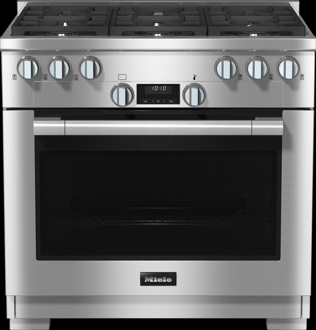 36 Inch Freestanding Gas Range with 6 Sealed Burners. This 36-inch Gas Range by Miele is the perfect addition to your home. Two convection blowers inside the oven provide rapid heat-up of the oven and optimum hot air distribution. The range's cooktop offers maximum variety with 6 powerful burners. The Miele oven switches off before the end of the program and makes use of residual heat to complete the cooking process.