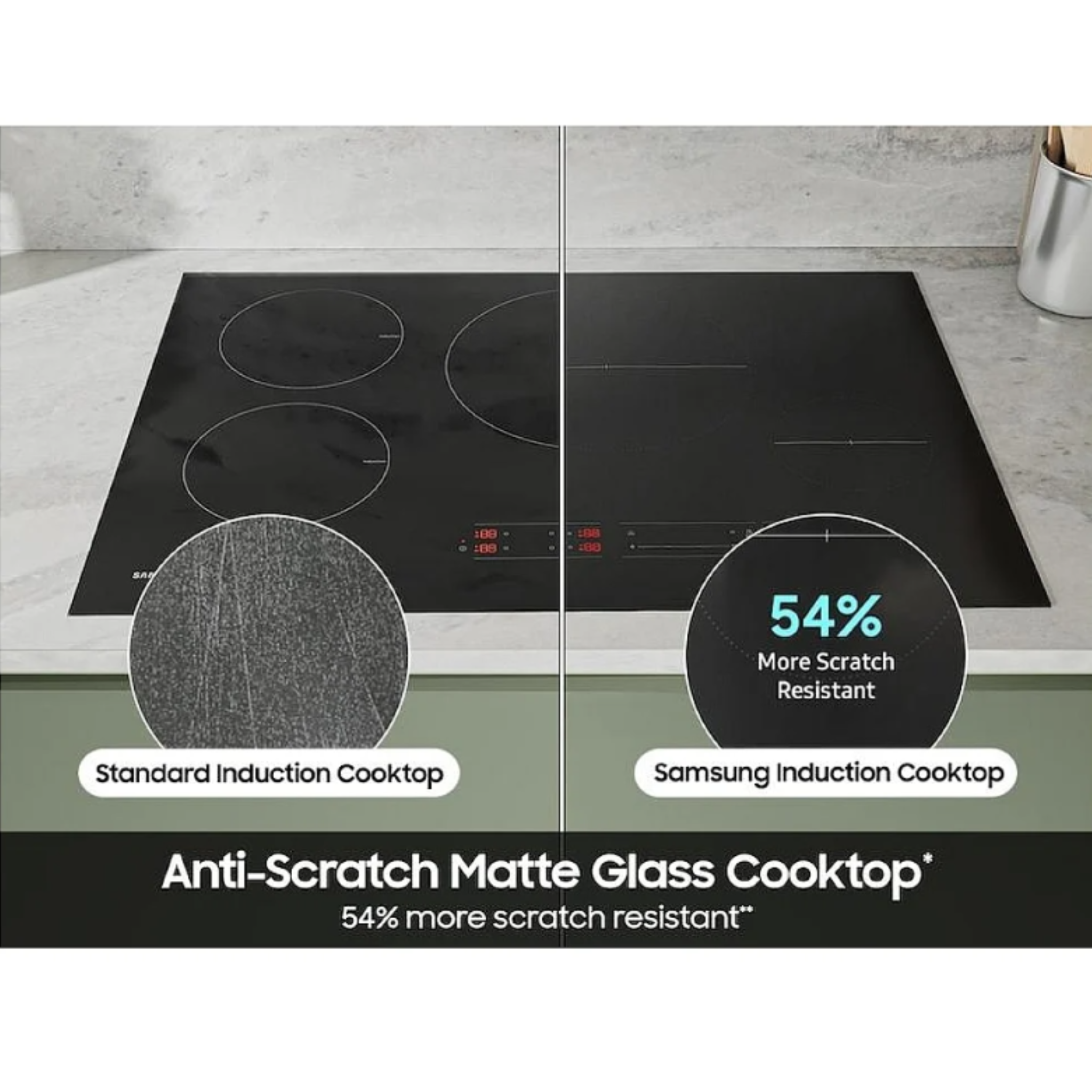 The Anti-Scratch Matte Glass Cooktop¹ is 54% more scratch resistant², more durable and less likely to get marked by cookware or cleaning.