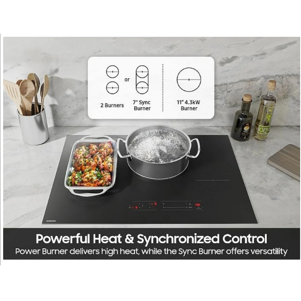The 30 inch induction cooktop features multiple induction burners, including a powerful 4.3kW Power Burner, which provides intense heat and precise control. All of the burners also have a Power Boost function that gives a short extra boost of heat to speed up cooking.