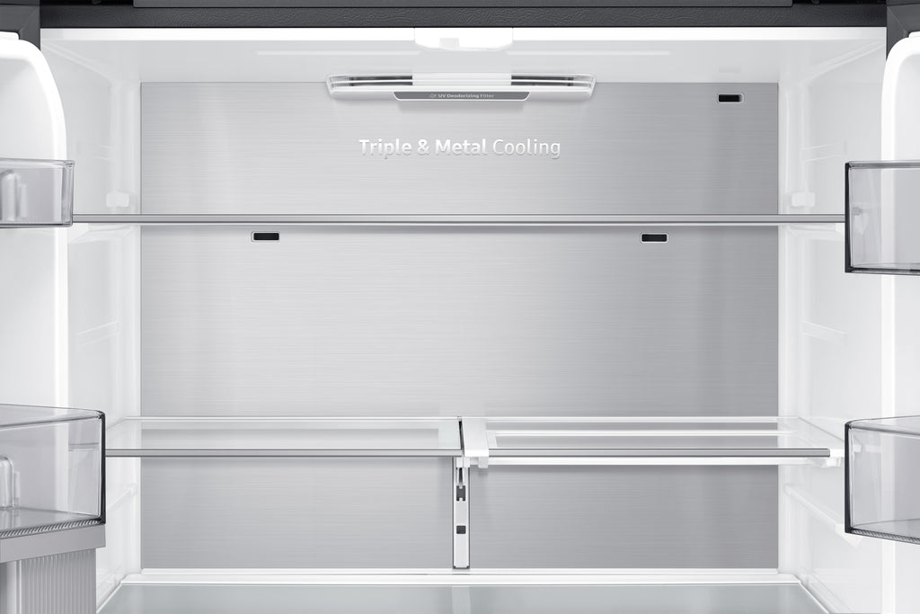 Ensure food stays moist and fresh for longer. Triple Cooling system optimizes the temperature and humidity in the fridge and freezer with independent cooling. It preserves food better and protects its flavour by preventing odours from mixing. Precise Cooling system minimizes temperature fluctuation and the Metal Cooling plate efficiently reserves cool air inside the fridge.