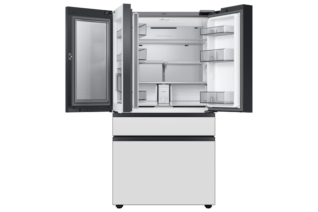 A 4-Door Bespoke refrigerator featuring a customizable design with a Beverage Center and a Dual Auto Ice Maker, plus a large storage capacity. This model is compatible with BESPOKE panels.