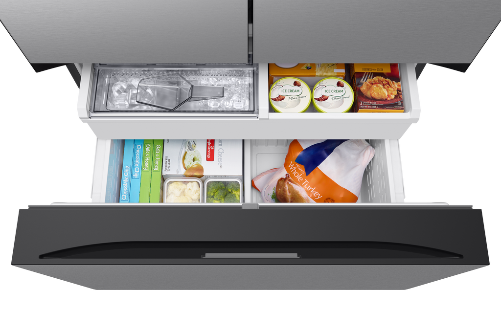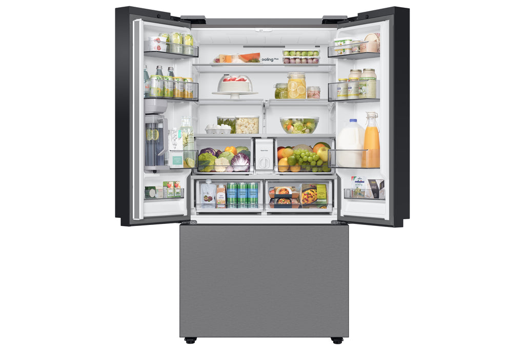 A French door Bespoke refrigerator featuring a customizable design with a Autofill Pitcher and a Dual Auto Ice Maker, plus a large storage capacity.