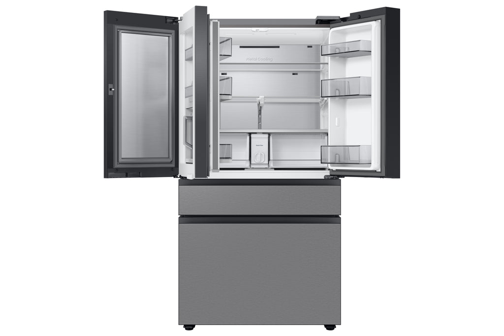 A 4-Door Bespoke refrigerator featuring a customizable design with a Beverage Center and a Dual Auto Ice Maker, plus a large storage capacity. This model is compatible with BESPOKE panels.