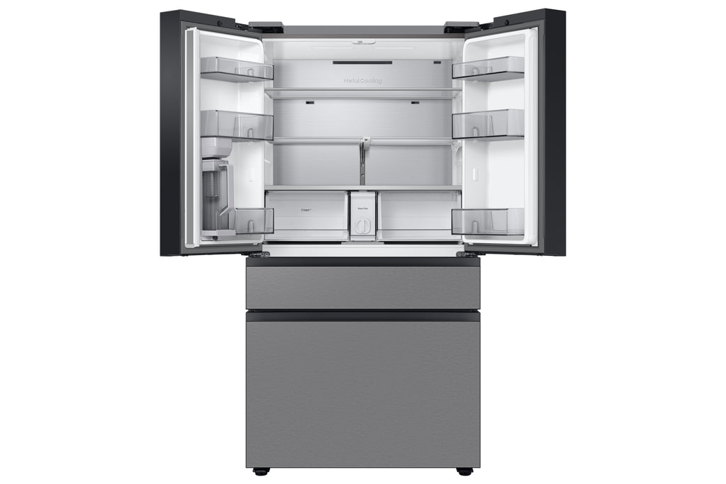 A 4-Door Bespoke refrigerator featuring a customizable design with a Autofill Pitcher, and a Dual Auto Ice Maker, plus a large storage capacity.