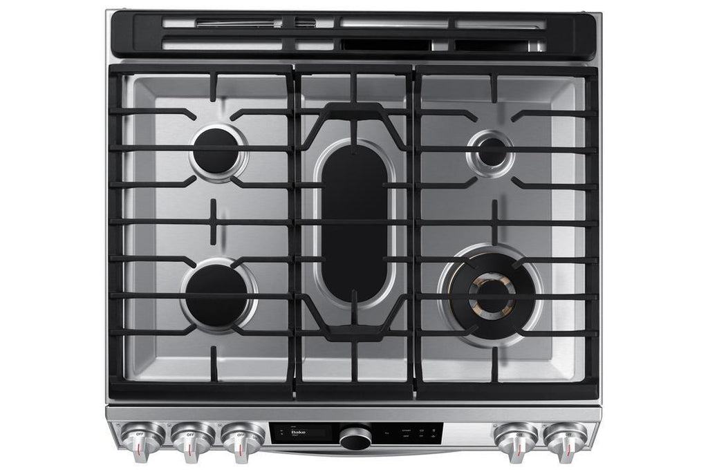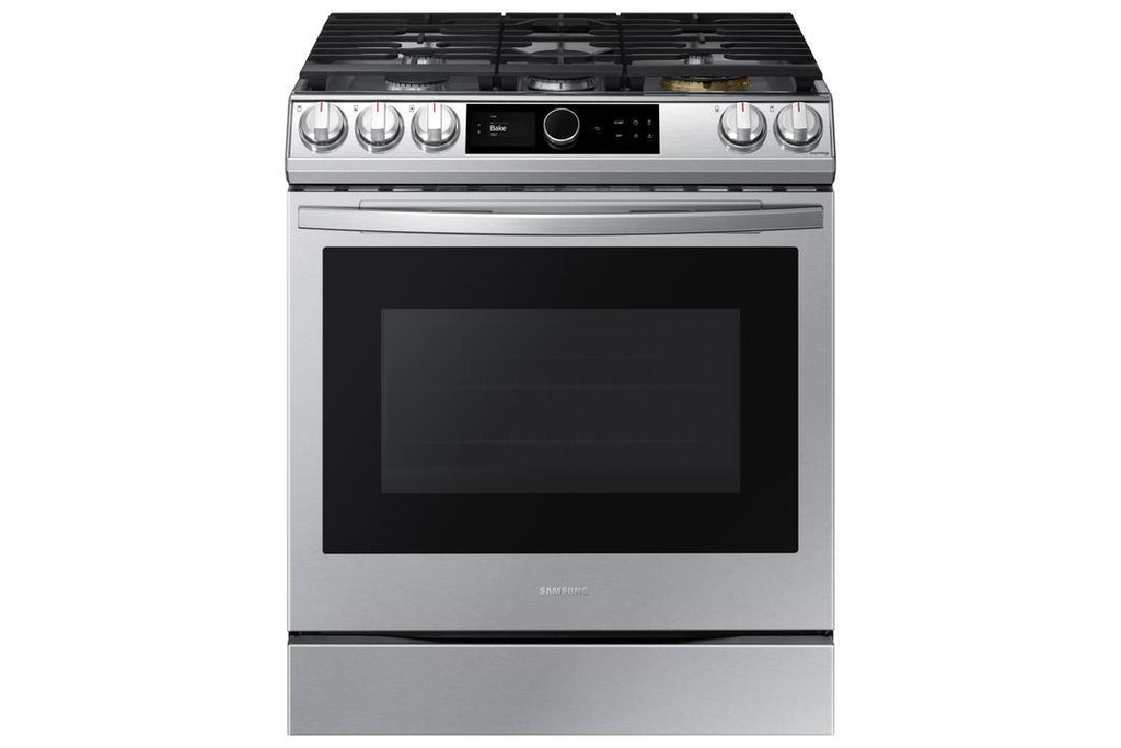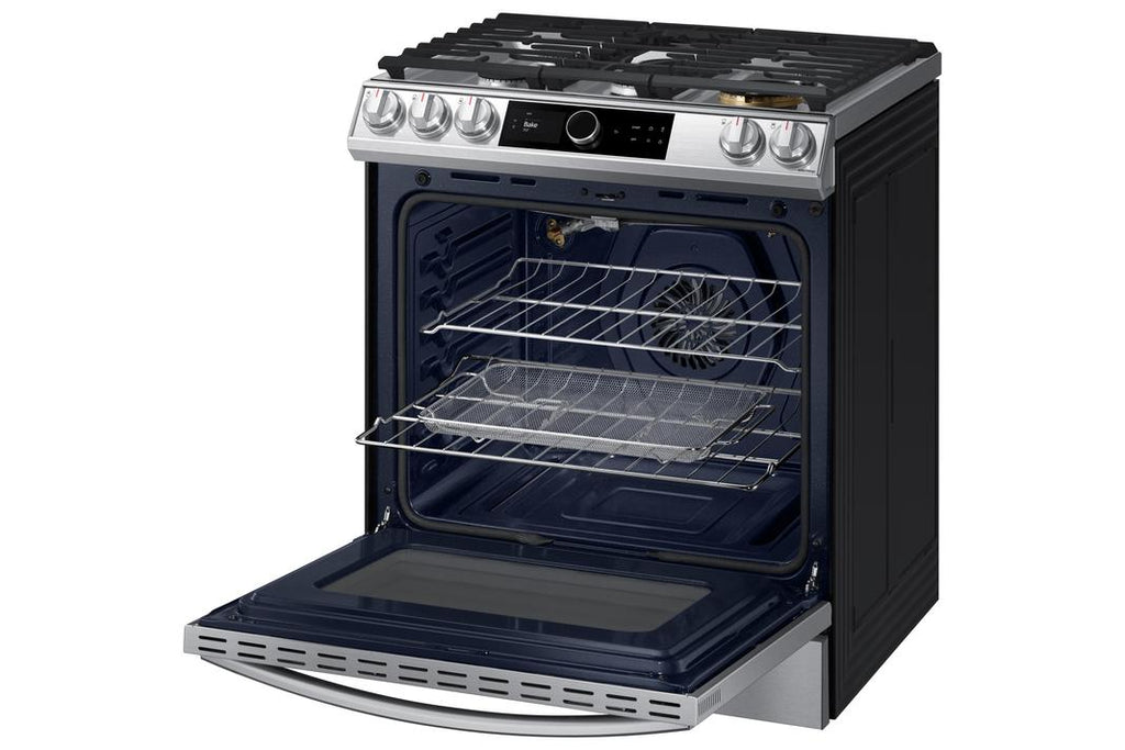 Give your kitchen a premium and stylish built-in look. The oven's slide-in design provides a modern and harmoniously integrated appearance, but is very easy to install. Simply nestle it between your existing cabinets to instantly upgrade your kitchen décor without the hassle of any major remodeling. And it makes cooking much safer and more convenient, as it has the controls at the front, so you don't have to reach across hot pans or lit burners to use them.