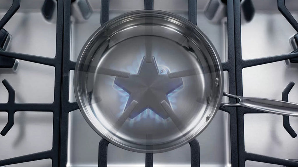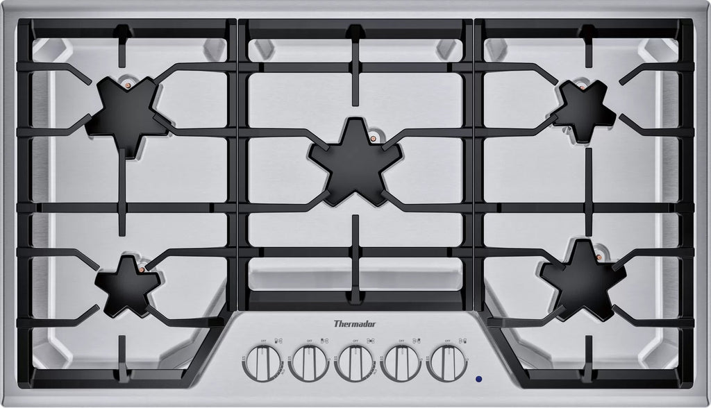 This gas cooktop belongs to the Masterpiece Series by Thermador. It has a stainless steel finish and a sleek design that complements any kitchen. It has five Star burners that offer more ports and more flame distribution than a round burner. They also have a unique shape that allows for more space between the burners and easier cleaning. And this gas cooktop is STAR-K compliant and has a Sabbath mode that allows the cooktop to operate in compliance with kosher cooking practices.