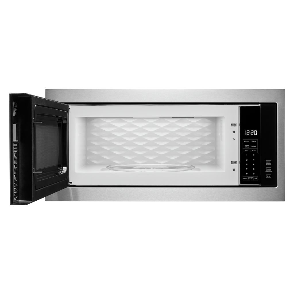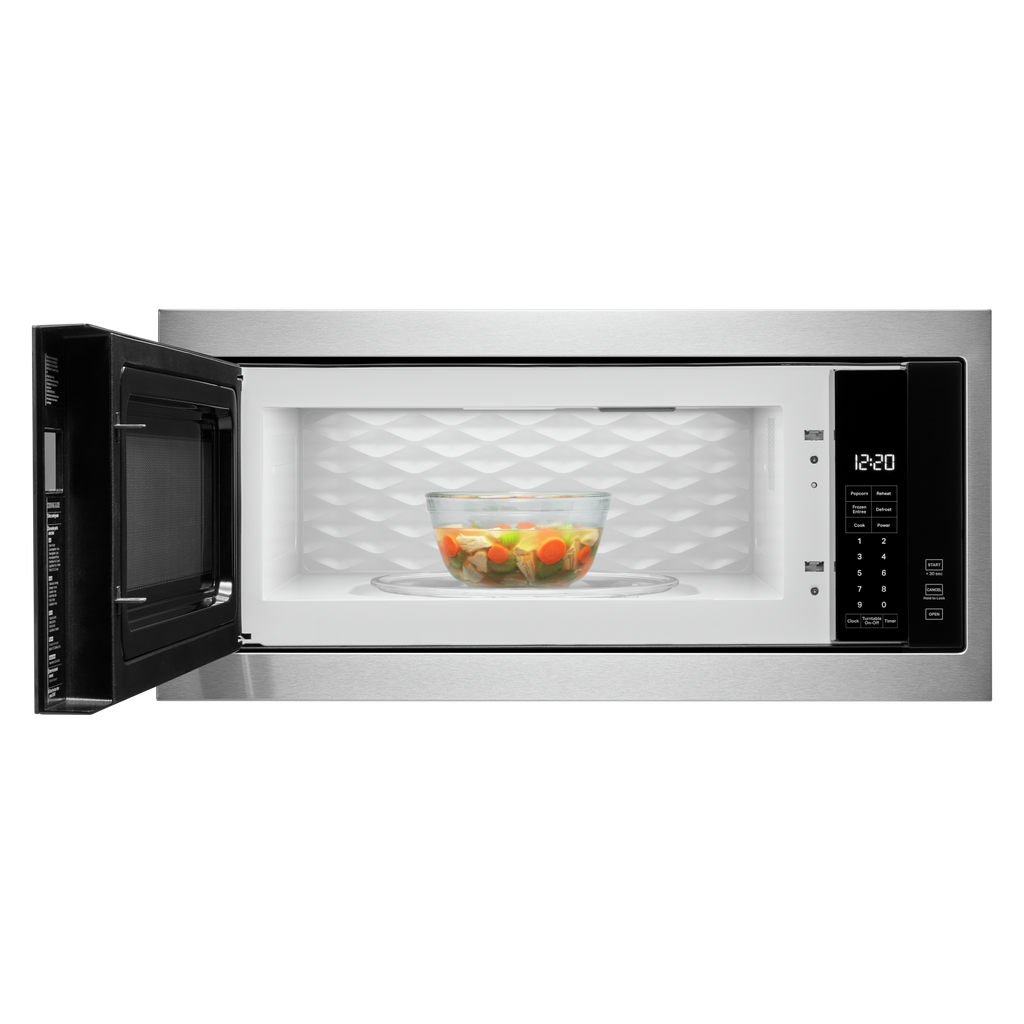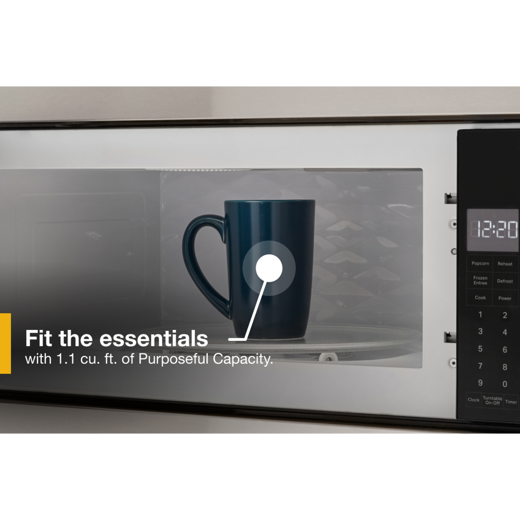 Fit tall glasses, wide plates and big bowls in this built-in microwave with 1.1 cu. ft. of Purposeful Capacity for all of the essentials.