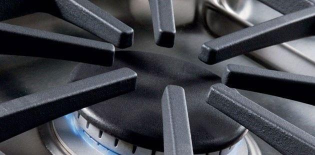 Continuous cast-iron grates with a matte black, porcelain finish let you slide pots easily on and off heat, or from one burner to another.