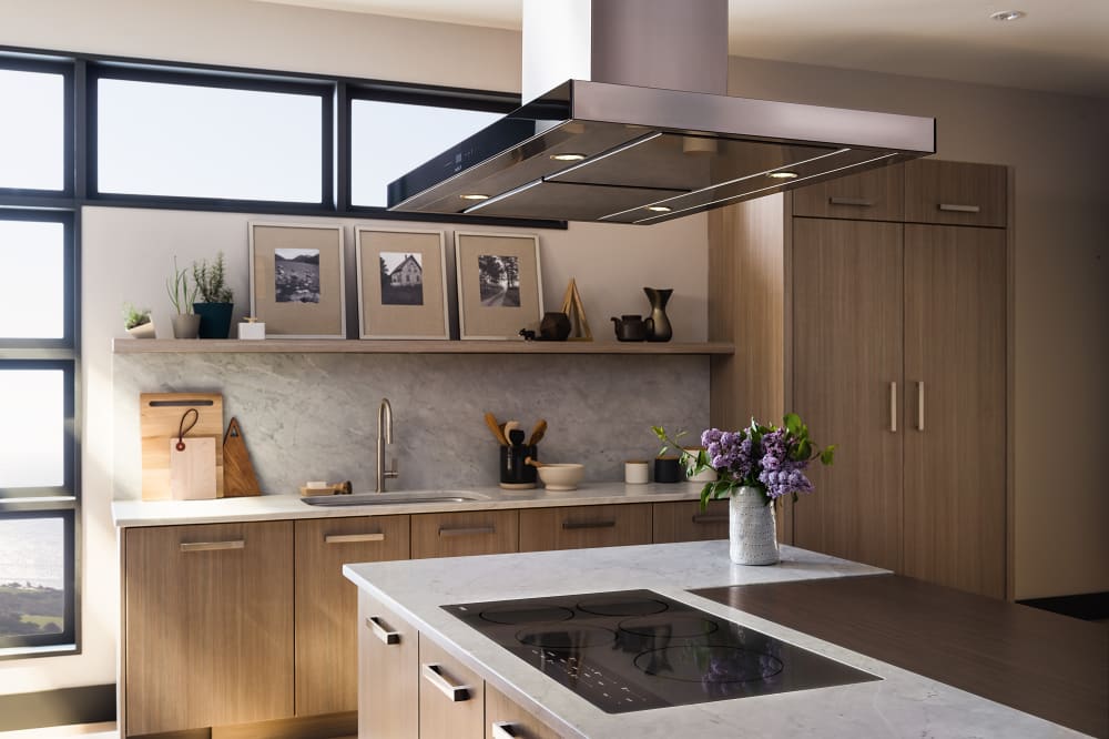 Wolf's frameless contemporary induction cooktops can be mounted flush with the top of a countertop or sitting on top of the countertop surface.